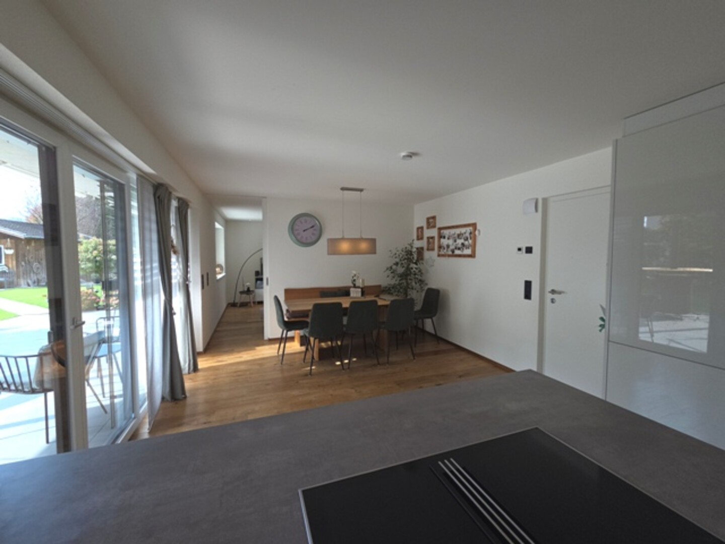 Das Wohnhaus verfügt im Erdgeschoss über einen Gang/Garderobe, ein Gäste-WC, einen großen Koch- Essbereich mit eine modernen Einbauküche inklusive hochwertigen Elektrogeräten und einer Kochinsel, ein Wohnzimmer und ein Technik-/Hauswirtschaftsraum. Im EG befinden sich auch einr überdachter Terrasse, ein Abstellraum und ein Carport.