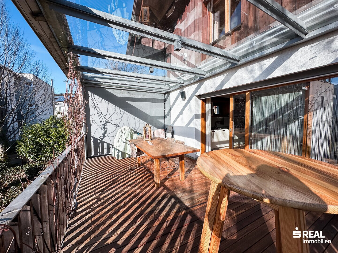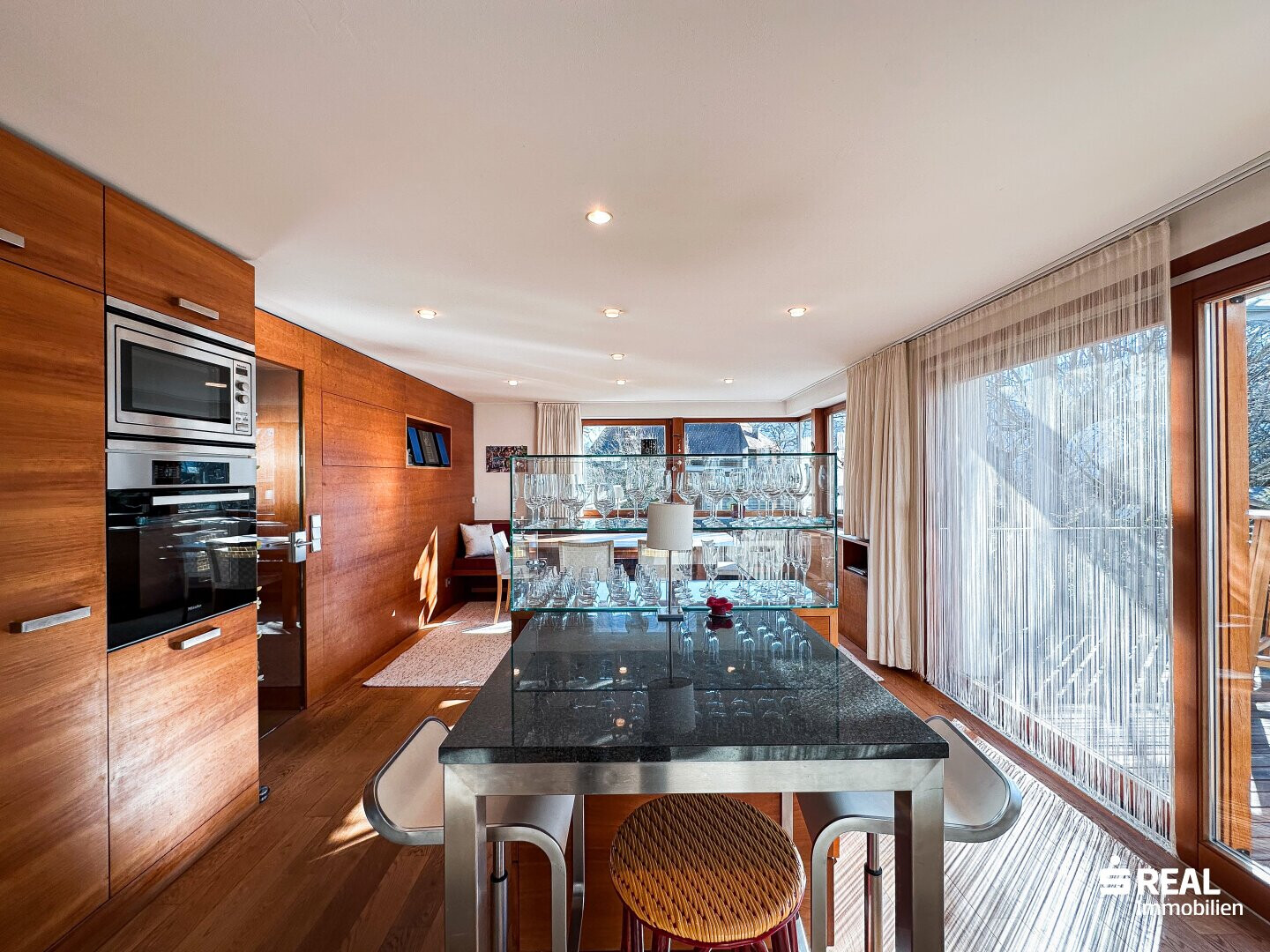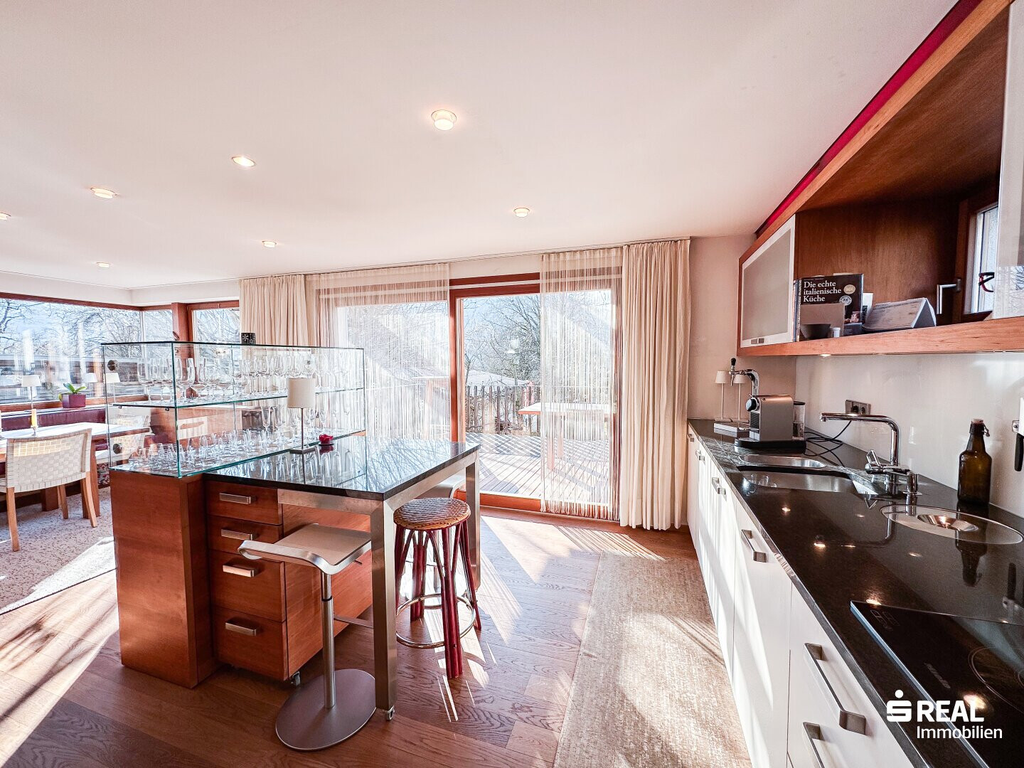 In diesen modern gestalteten Räumlichkeiten mit Zugang zur großen, überdachten Terrasse lässt es sich gut leben und genießen.