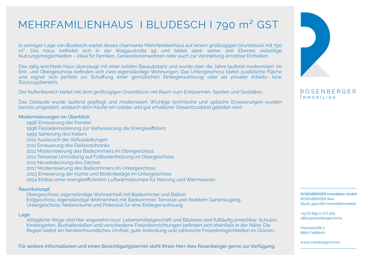 In sonniger Lage von Bludesch wartet dieses charmante Mehrfamilienhaus auf einem großzügigen Grundstück mit 790 m². Das Haus befindet sich in der Walgaustraße 59 und bietet dank seiner drei Ebenen vielseitige Nutzungsmöglichkeiten – ideal für Familien, Generationenwohnen oder auch zur Vermietung einzelner Einheiten.