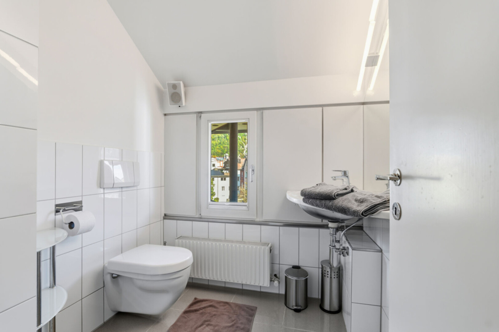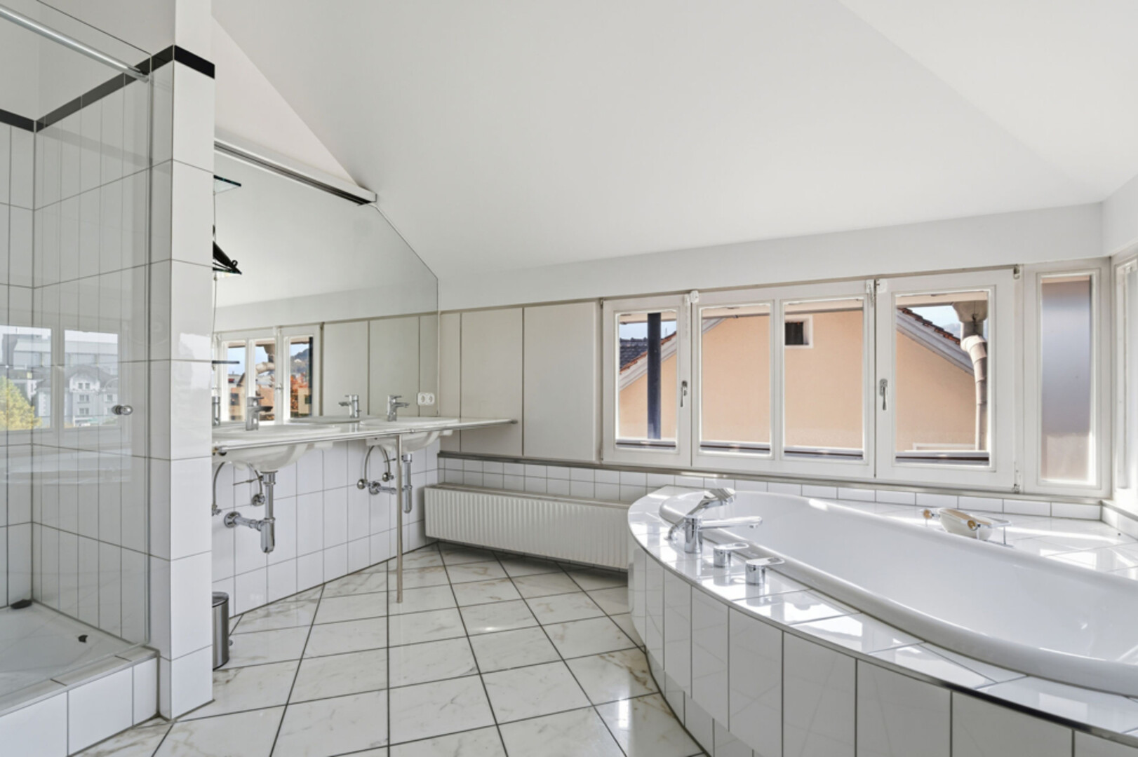 Die größere der beiden Wohneinheiten verfügt über etwa 147 m² und erstreckt sich über zwei Stockwerke. Der helle und offene Wohn-Essbereich mit Terrasse sowie die Küche mit Speisekammer befinden sich im 2.Obergeschoss, über eine Treppe erreichen Sie das Dachgeschoss, hier befinden sich 3 Schlafzimmer, ein Badezimmer, ein separates WC und ein Abstellraum mit Waschmaschine und Trockner.