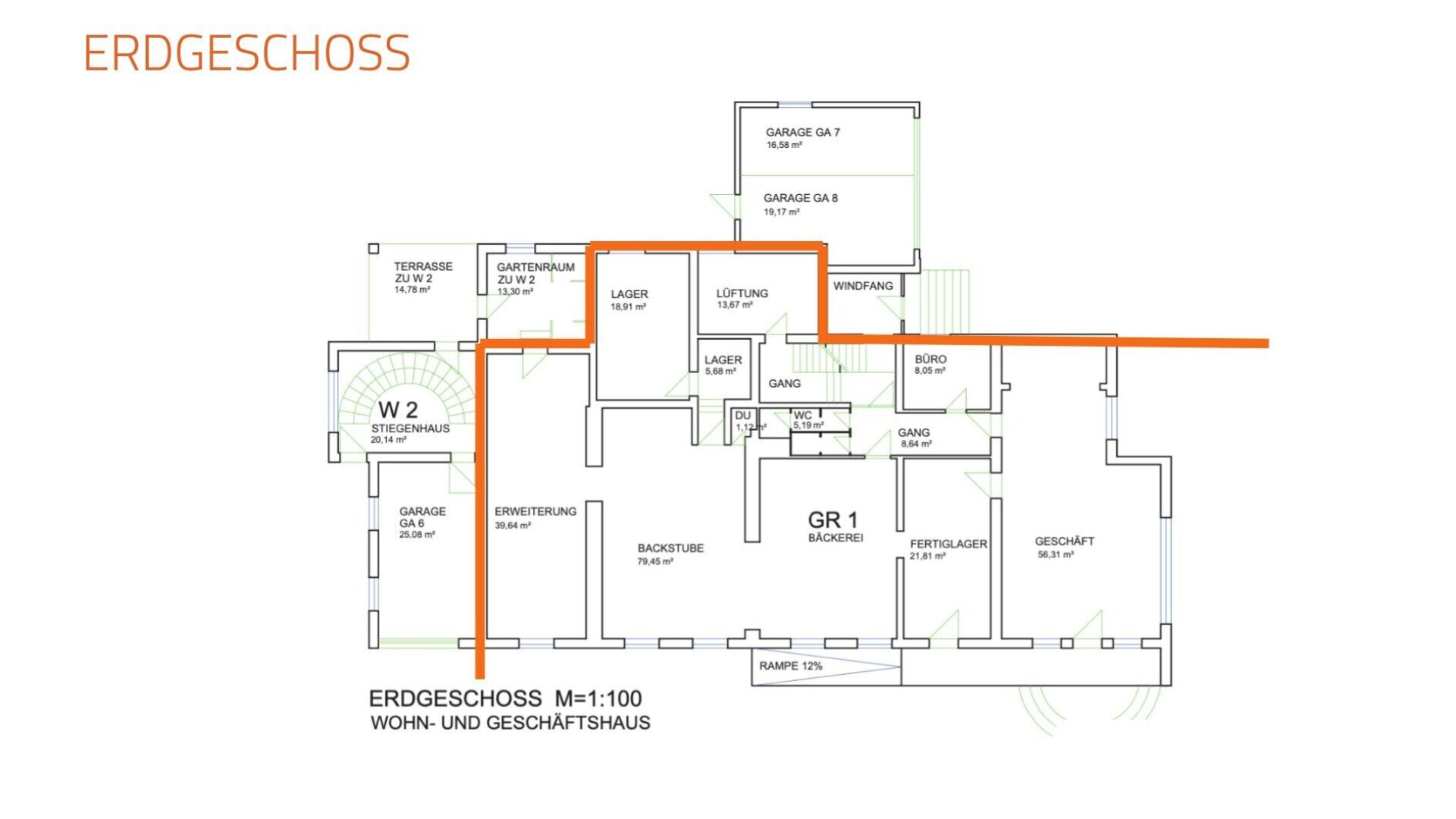Im Erdgeschoss befindet sich eine ehemals genutzte Bäckerei mit einem angrenzenden Verkaufsladen (GR1).