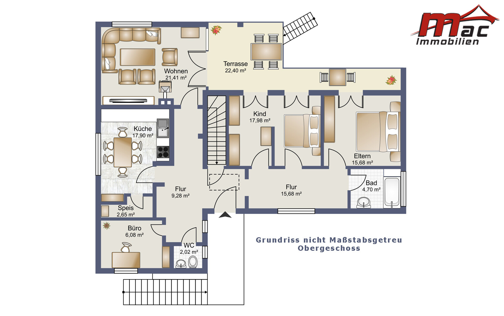 Im Obergeschoss lädt eine großzügige Terrasse mit rund 22,4 m² in südlicher Ausrichtung zum Verweilen ein.