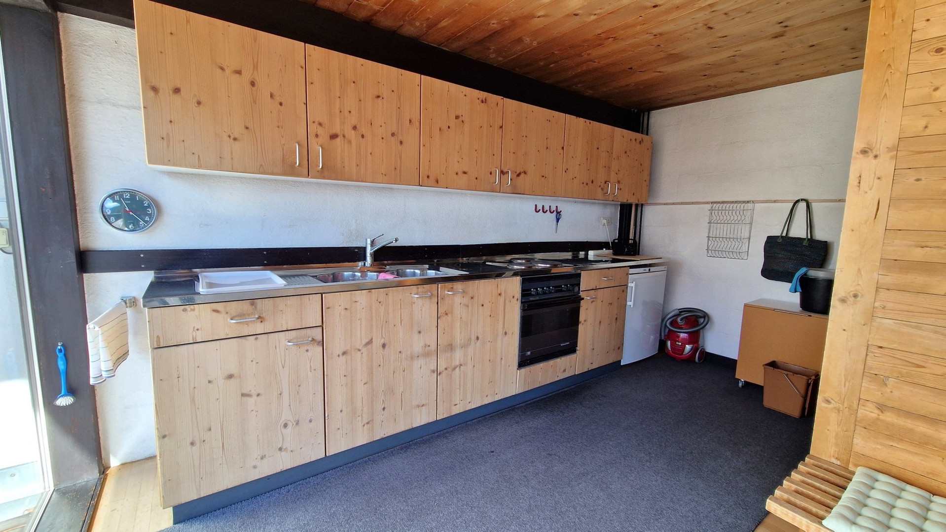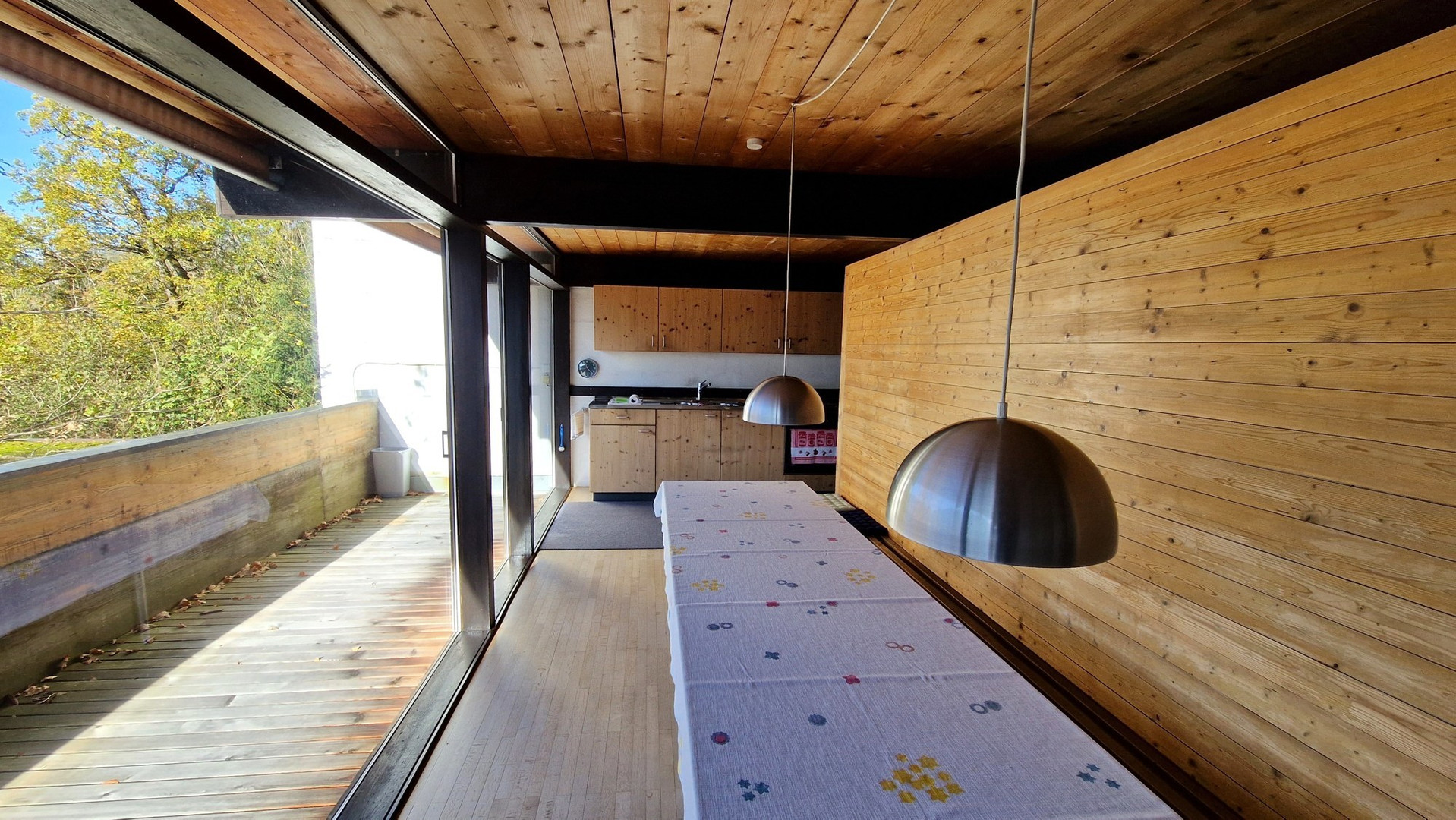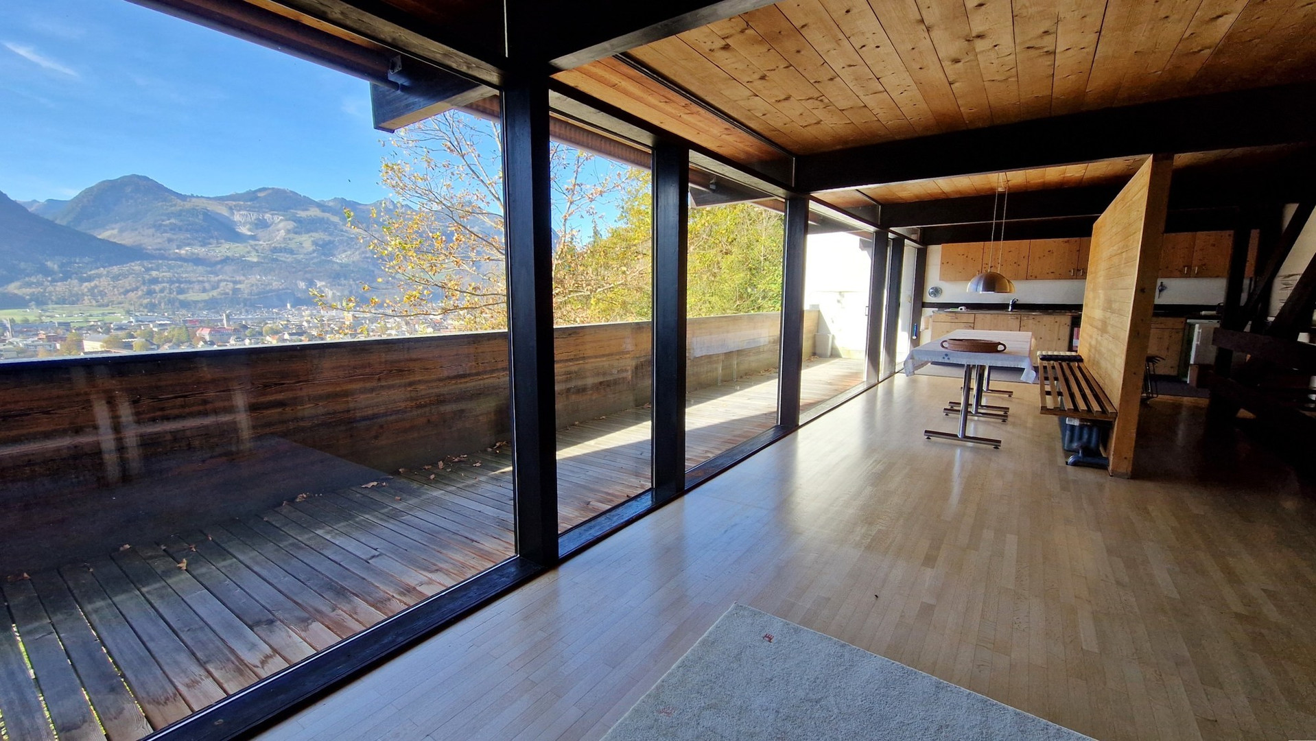 Das zweite Wohngeschoß ist als durchgängiger Wohn- und Esszimmer-Bereich gestaltet. Der Raum ähnelt einem Loft und ist zur Talseite und dem dort vorhandenen Balkon hin raumhoch verglast.