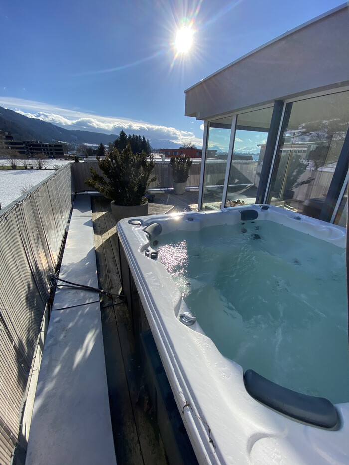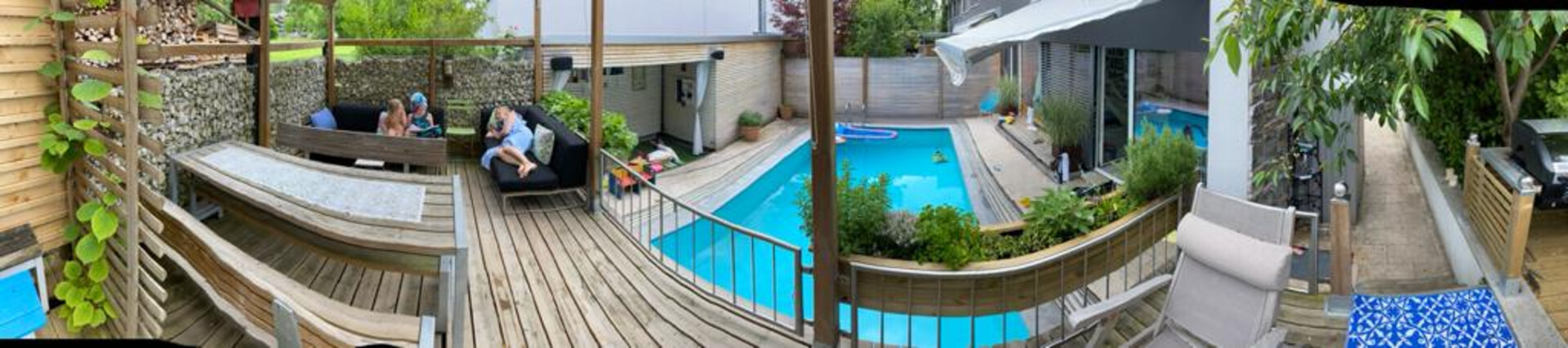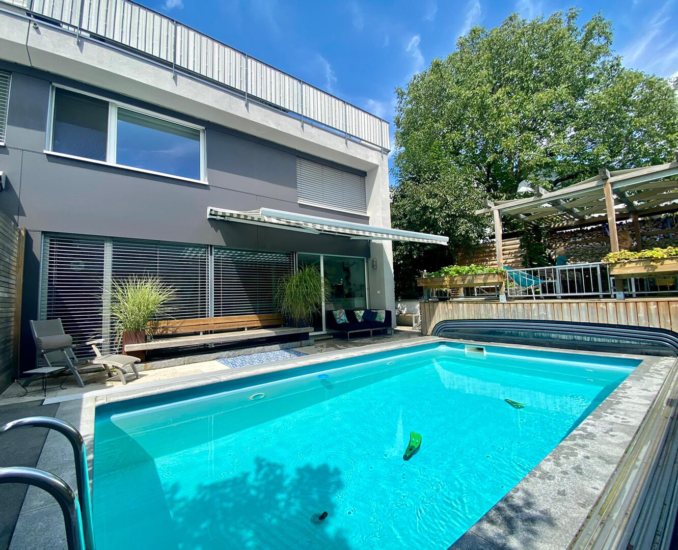 Der Garten nordseitig (ca. 100m2) liegt idyllisch angrenzend zum lochauer Dorfbach und ist derzeit mit Spielhaus, Rutschbahn, Schaukeln, Sitz-Klettermöglichkeiten und Pflückobst für Kinder ein Paradies. Auf der Südseite des Gartengrundstücks befindet sich ein Swimming Pool (7m x 3,5m) der mittels Luftwärmepumpe geheitzt wird (Verlängerung der Badesaison von Mitte April bis Ende September). Die absperrbare Poolüberdachung ist nicht nur aus Sicherheitsgründen sehr wichtig, sondern auch für die Poolpflege und die Wärmeerhaltung des Wassers von Vorteil! Ebenfalls kann man auch bei schlechtem Wetter unter der Poolüberdachung wunderbar schwimmen. Die Poolbeleuchtung erzeugt Abends eine südländische "Urlaubsstimmung" Neben dem Pool liegt auch die Aussenterasse mit schattenspendender Pergola und einem tollen Grillplatz unter einem Kirschbaum. Ebenfalls ein Highlight ist die warmwasser Gartendusche, sowohl nach dem Baden als auch nach der Arbeit und Nachts unterm Sternenhimmel.