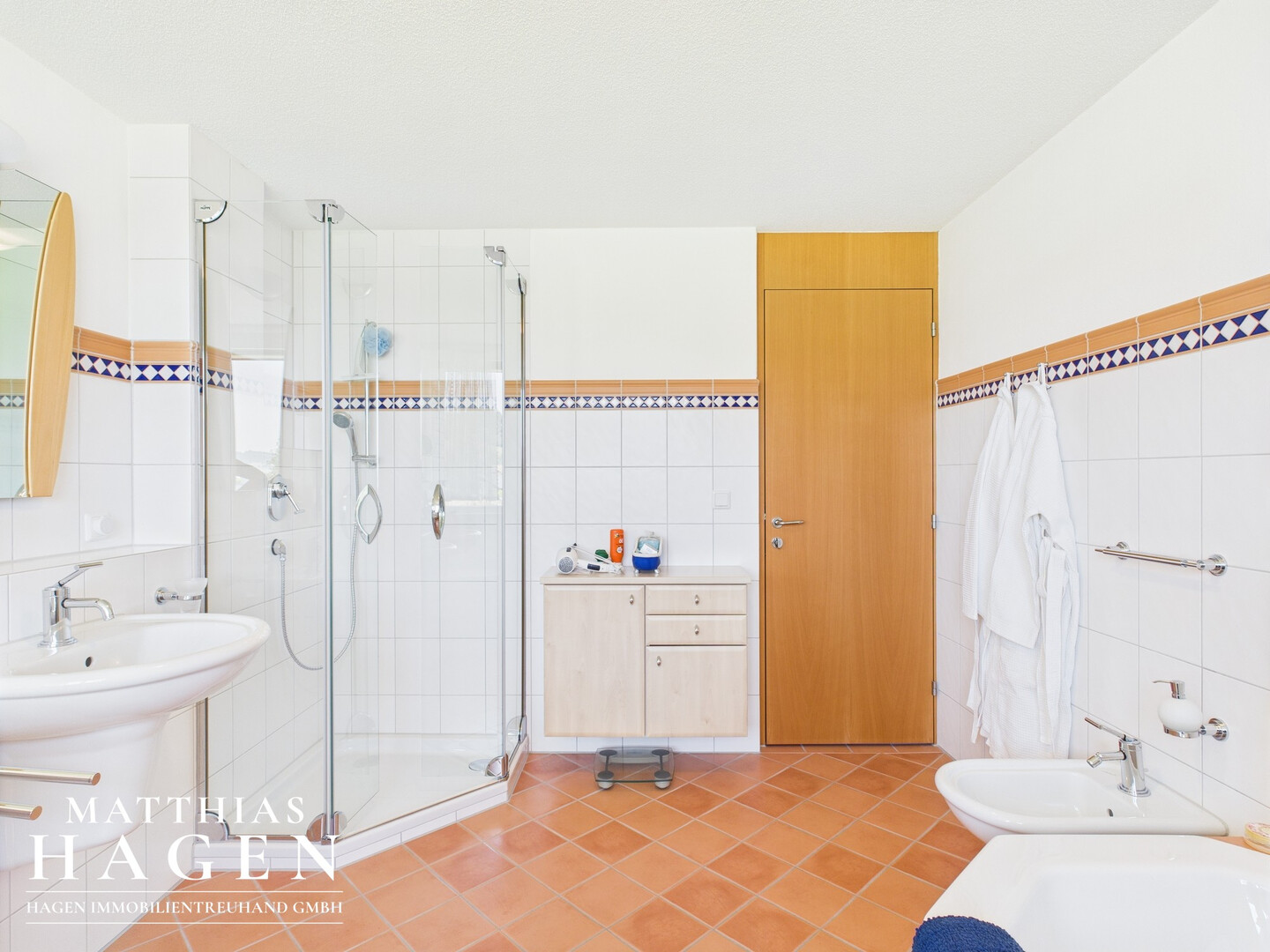 Im Obergeschoss erwarten Sie drei geräumige Schlafzimmer, die viel Platz für Familie, Gäste oder Homeoffice bieten. Das große Badezimmer ist mit Dusche, Badewanne, Fenster, Doppelwaschbecken und sogar einem Bidet ausgestattet – ideal für den entspannten Start in den Tag.