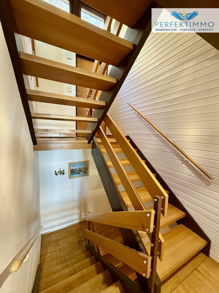 Eine Treppe führt in die mittlere Etage, die das Schlafzimmer, ein weiteres kleineres Zimmer, das Badezimmer mit Badewanne und ein separates WC beinhaltet