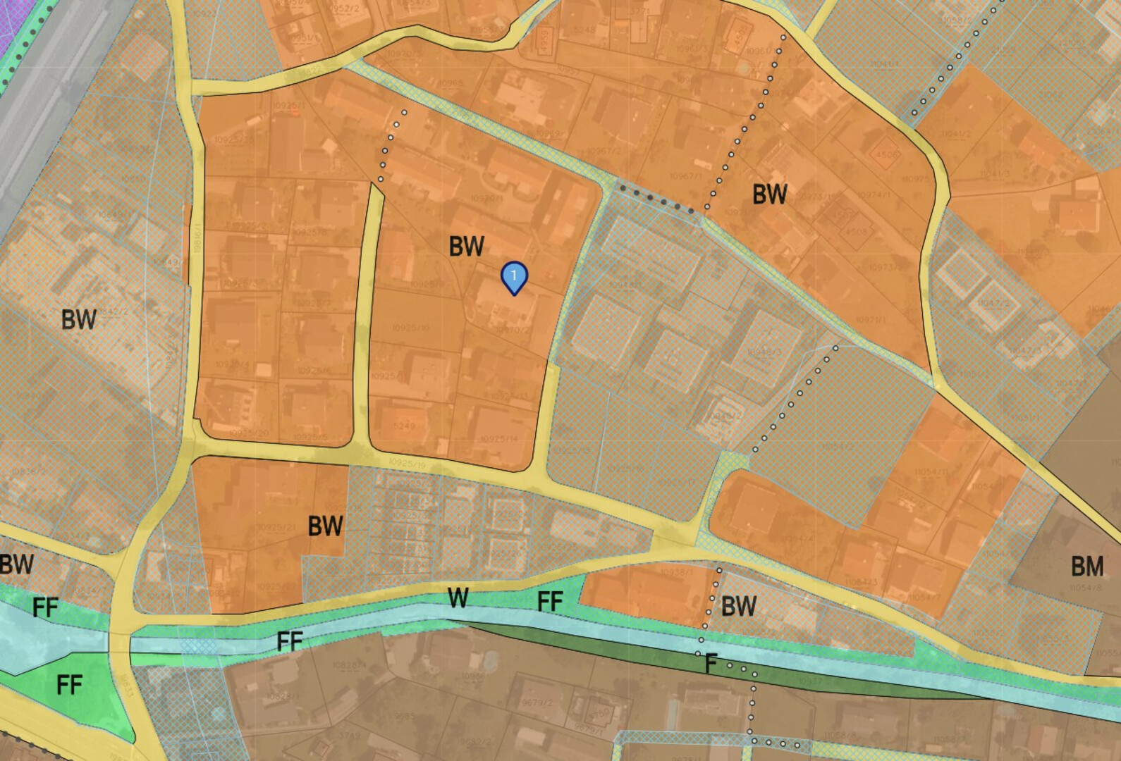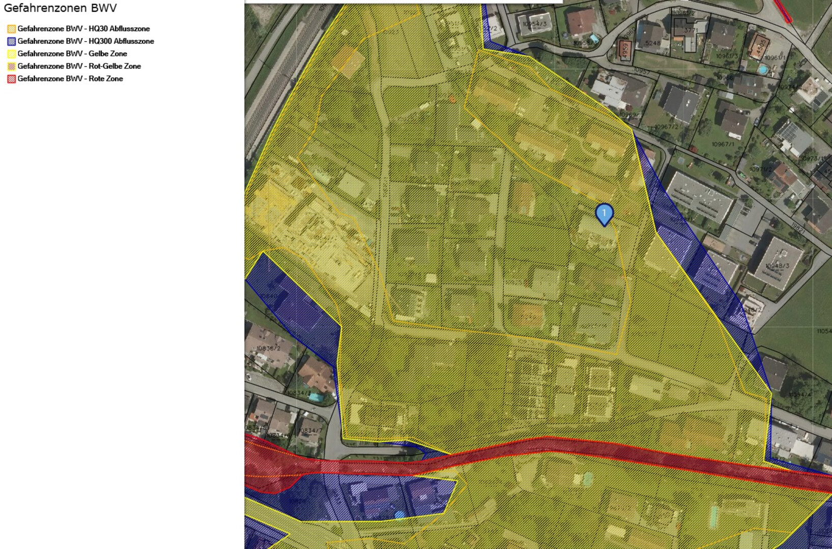 Das Objekt befindet sich gemäß aktueller Ausweisung in der Gefahrenzone BWV HQ300 (Abflusszone) sowie in der BWV Gelben Zone (Details siehe Fotogalerie).