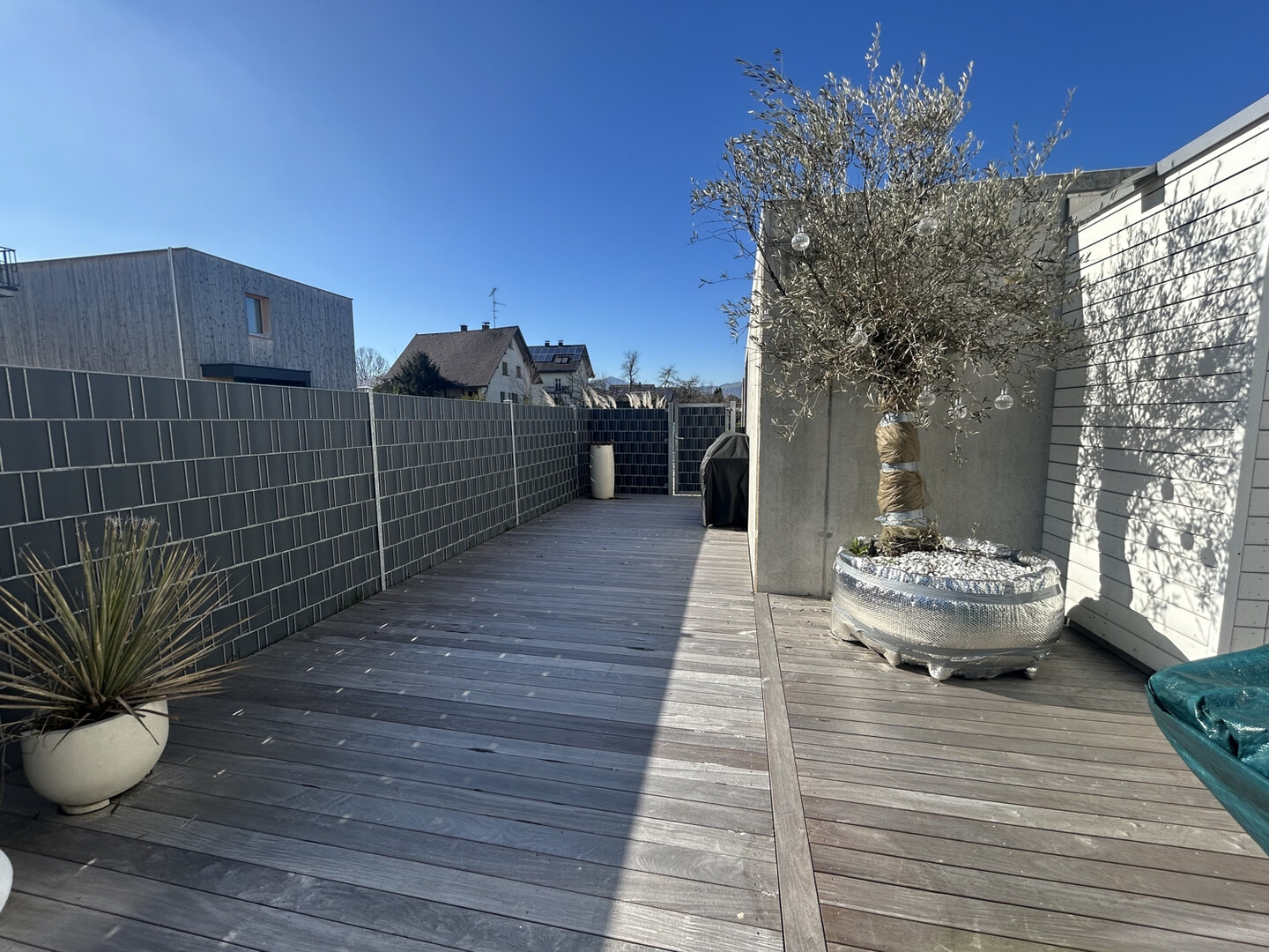 Die außergewöhnlich große Terrasse mit hochwertigem Lapacho-Holzbelag stellt ein echtes Highlight dar. Sie bietet nicht nur großzügige Freifläche, sondern auch Privatsphäre und Komfort. Der Gartenbereich eignet sich ideal für Familien, Ruhesuchende oder als repräsentativer Außenbereich für Gäste.