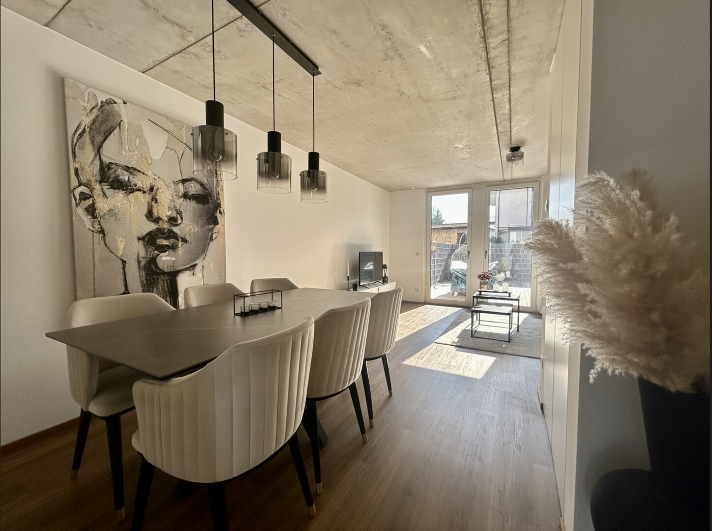 Die offene Gestaltung des Wohnbereichs schafft eine harmonische Verbindung zwischen Kochen, Essen und Wohnen. Großzügige Fensterflächen sorgen für viel Tageslicht und ein angenehmes Raumgefühl.