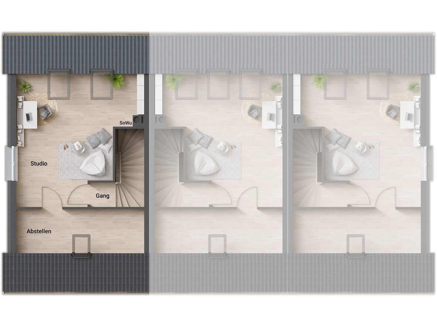 Unter dem Dach, im Dachgeschoß, schlägt das Herz tatsächlich höher – zumindest bei allen, die sich schon immer ein großzügiges Studio als kreativen Freiraum gewünscht haben. Die Ausführung mit Sichtbalken verleiht dem offenen Raum ein heimeliges und exklusives Ambiente. Zusätzlich ist im Dachgeschoß auch noch ausreichend Platz für einen Abstellraum vorhanden.
