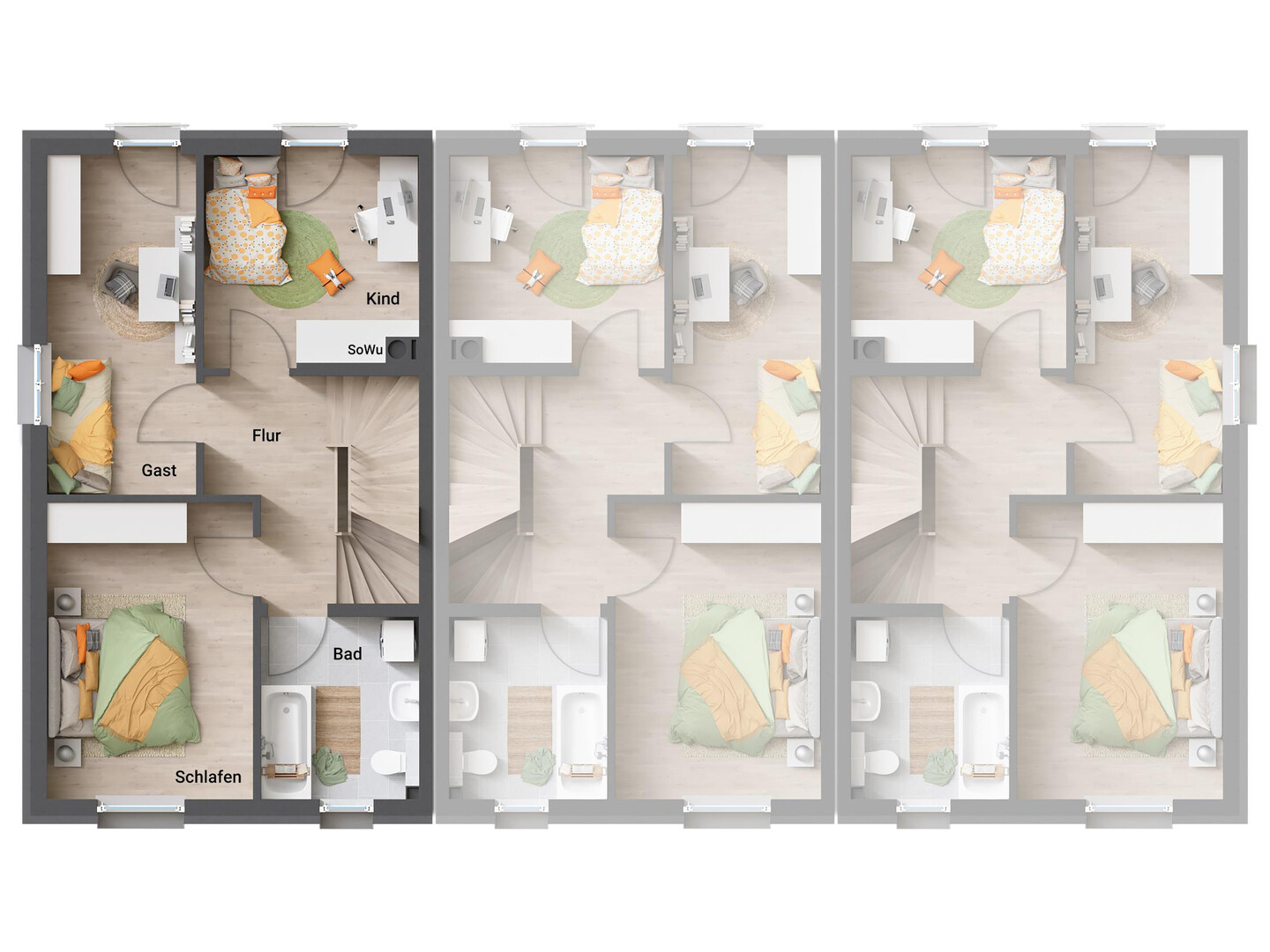 Im Erdgeschoß verfügen Sie über ein großes Wohnzimmer mit einladendem Essbereich. Die hohen Fenster machen Ihre Räume hell und freundlich und gewähren Ihnen freien Blick in den Garten. Über den geschwungenen Aufgang erreichen Sie das Obergeschoß mit einem gemütlichen Schlaf- und Gästezimmer sowie einem geräumigen Kinderzimmer und mit einem modernen Bad mit Fenster.