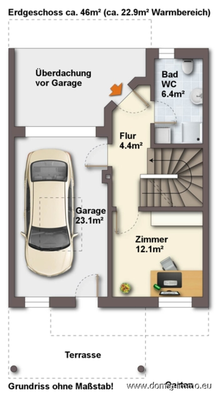 Die Garage präsentiert sich freundlich und ist zugleich der einzige Zugang zum kleinen, pflegeleichten Garten, da sich der gesamte Wohnbereich im 1. Obergeschoss befindet. Der Garten eignet sich ideal für entspannte Stunden im Freien. Zusätzlich bietet der Wohnbereich im 1. Obergeschoss eine überdachte Terrasse, die zu jeder Jahreszeit einen geschützten Außenbereich schafft.