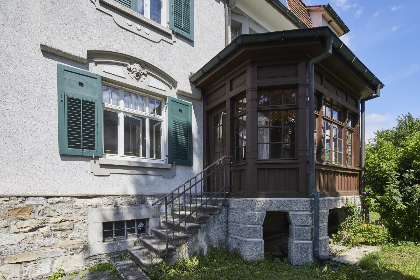 Der Naturstein-Sockel verleiht der Villa eine solide Basis, darüber präsentiert sich die Fassade glatt verputzt und elegant strukturiert. Die originalen Kastenfenster mit versprossten Oberlichten, Sandsteinrahmungen, Jalousieläden und markanten Sohlbänken erzählen vom architektonischen Feingefühl vergangener Zeiten. ✨