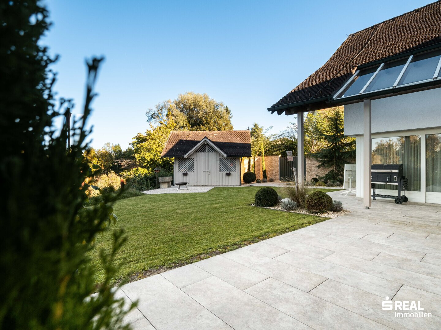 - Ein besonderes Highlight ist das zusätzliche Häuschen auf der gegenüberliegenden Seite des Weihers. Es eignet sich ideal als Partyraum für gesellige Abende oder als Hobbyraum, Rückzugsort oder Atelier – ein Ort, der Kreativität, Entspannung und Lebensfreude gleichermaßen Raum gibt.