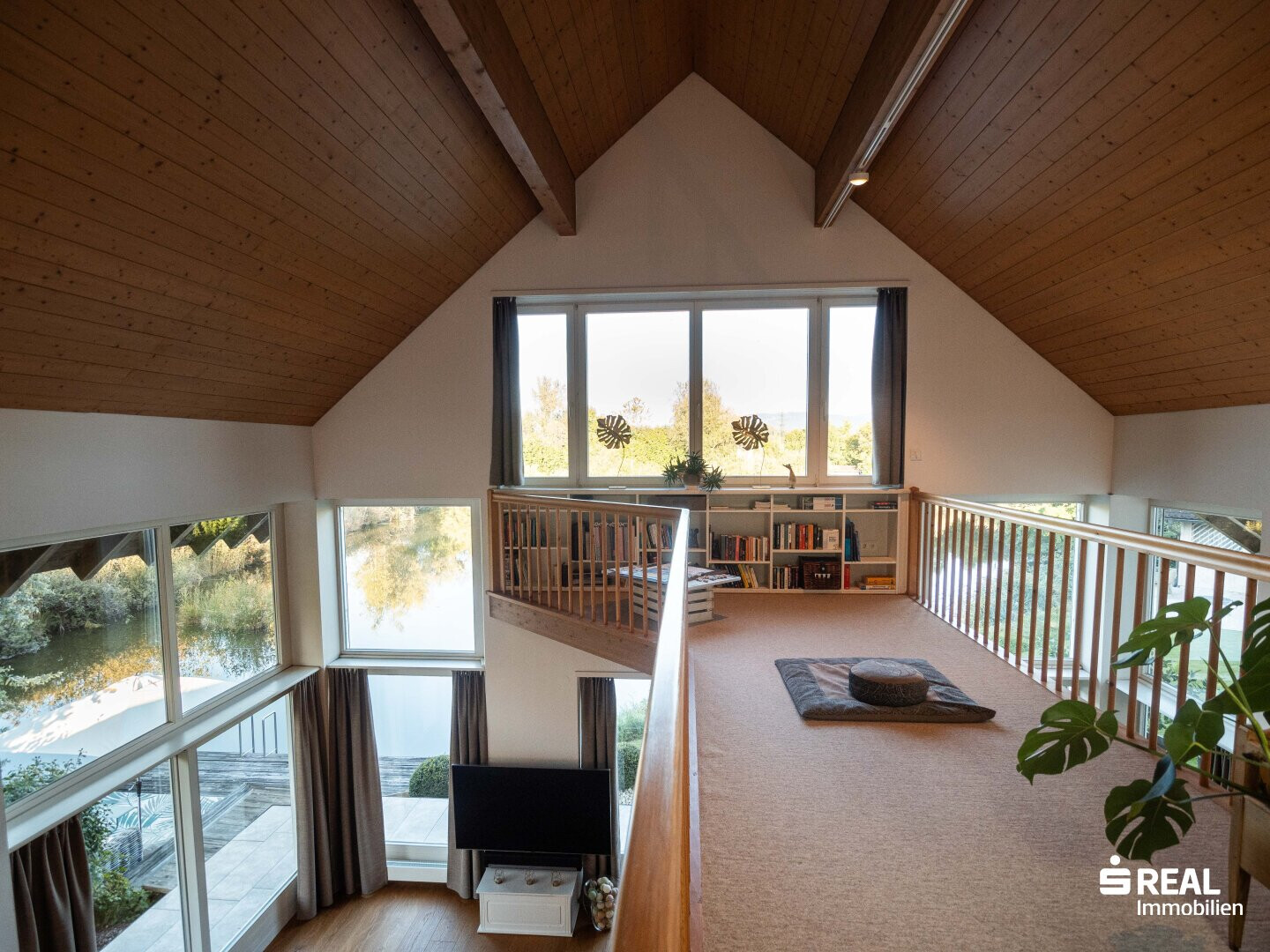 - Der weitläufige Wohn- und Essbereich mit offener Galerie und beeindruckender Raumhöhe ist lichtdurchflutet und schafft ein Gefühl von Weite und Freiheit. Große Glasfronten eröffnen einen ungestörten Panoramablick auf die Natur und den privaten Weiher.