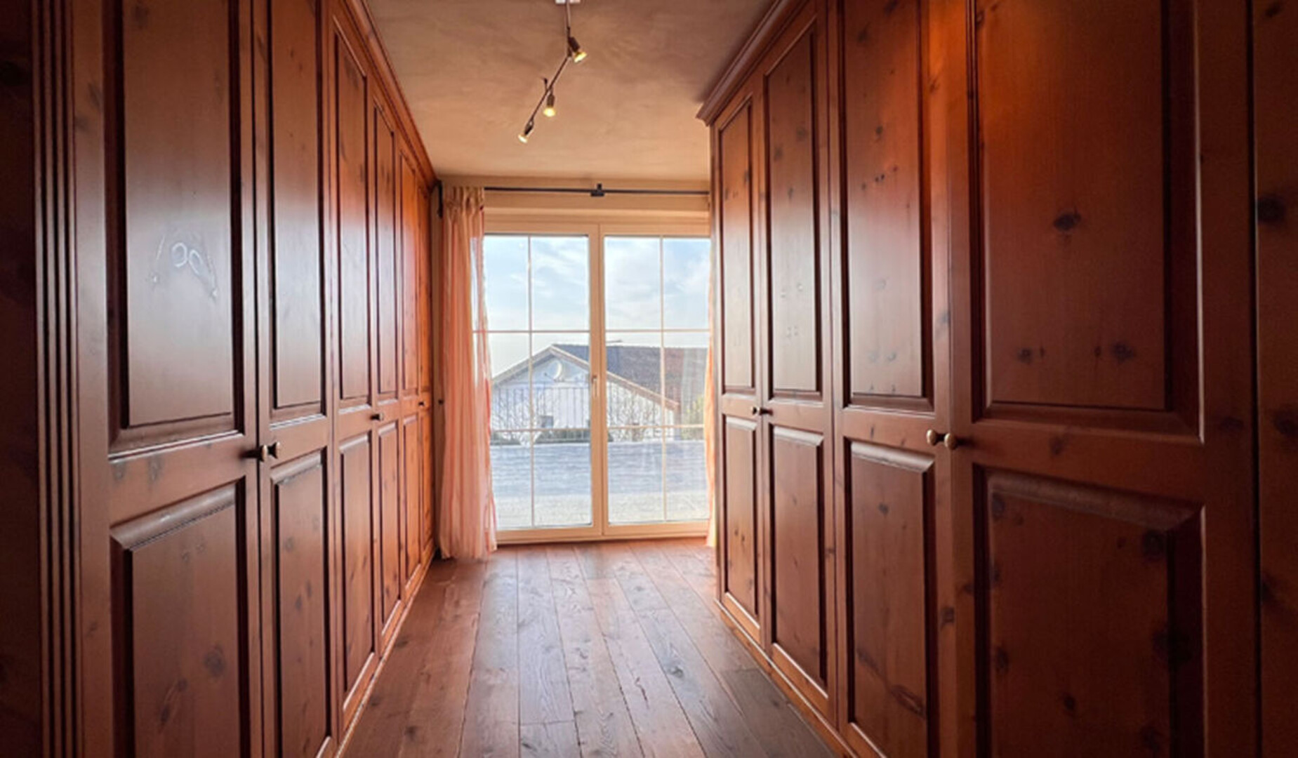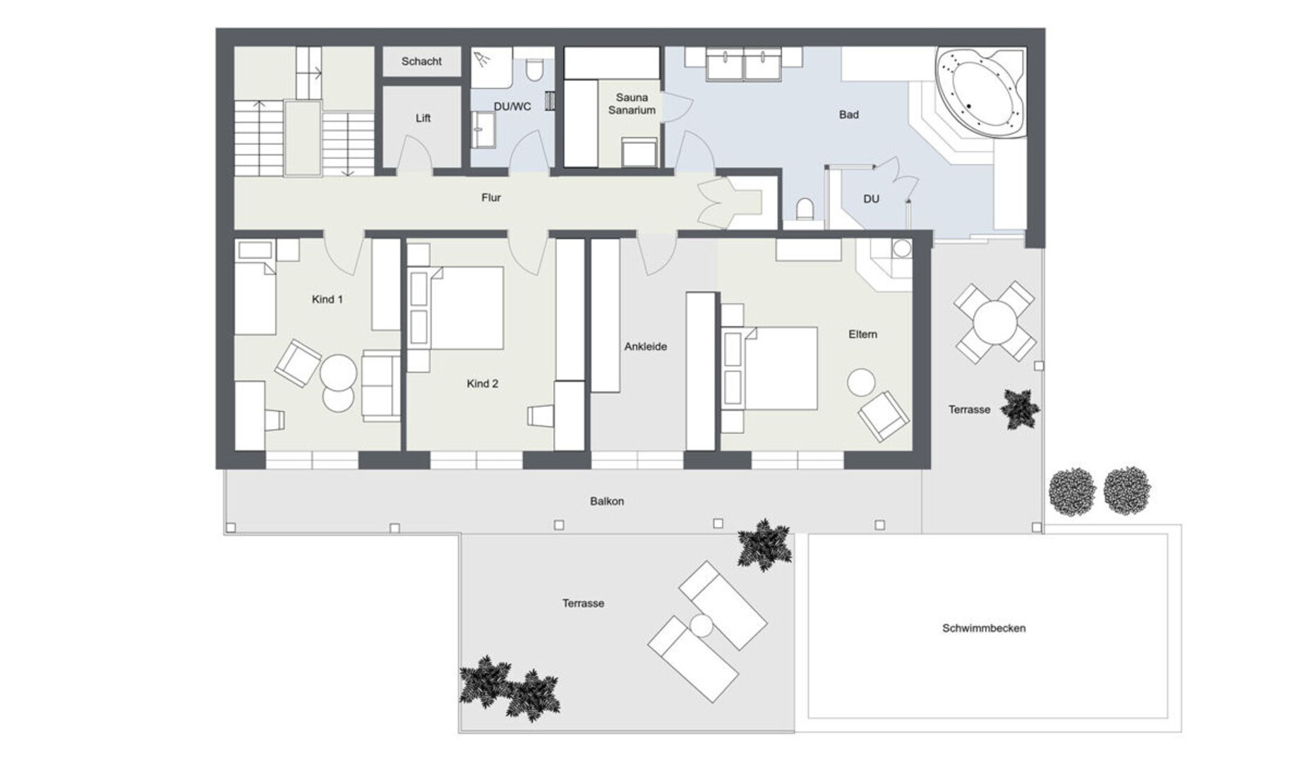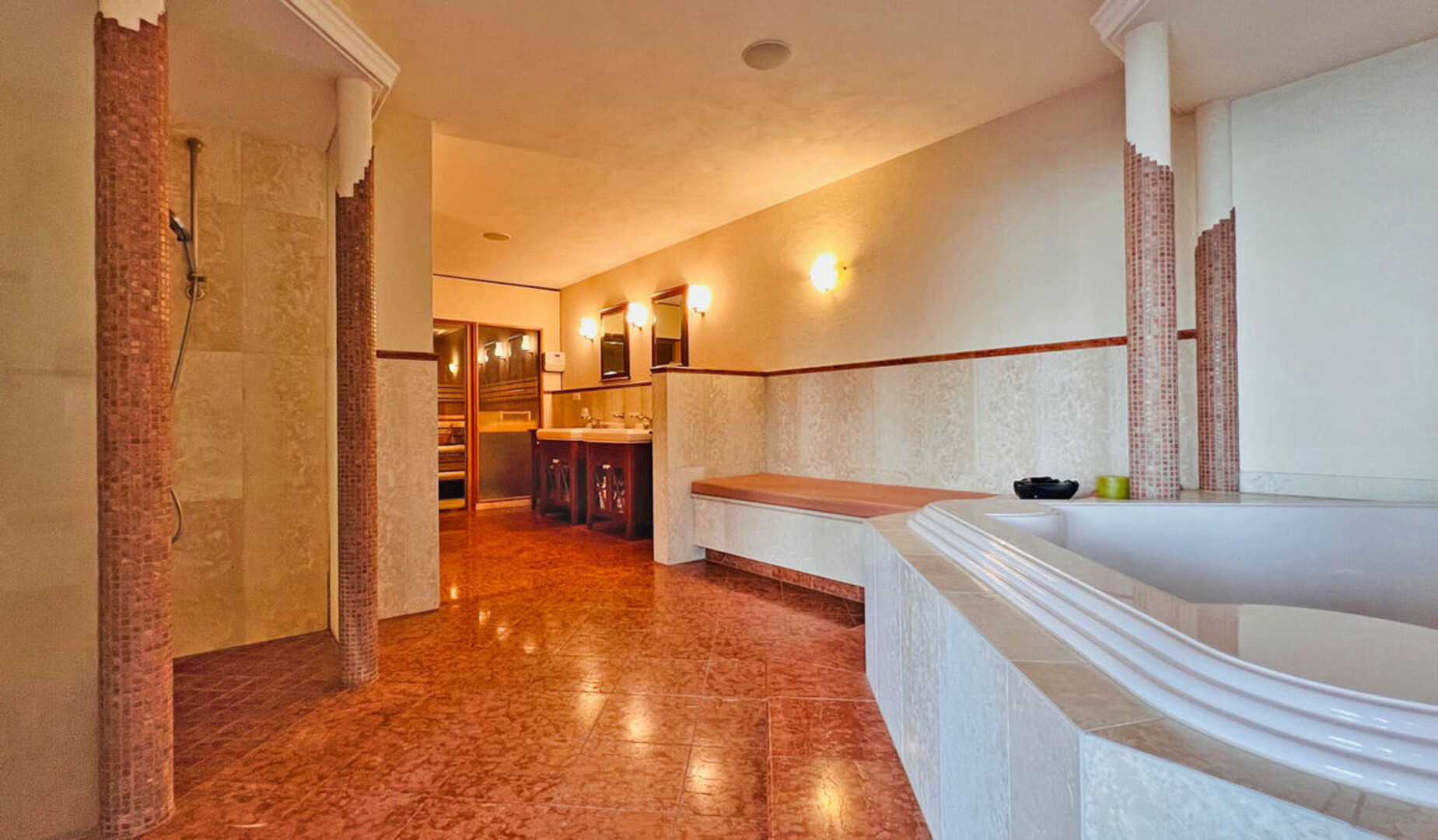 Im Obergeschoss erwartet Sie der private Rückzugsbereich mit mehreren Schlafzimmern sowie einer exklusiven Wellnesslandschaft. Hochwertige Landhausfliesen ziehen sich elegant durch die Flure, während in den Schlafräumen rustikales Parkett aus geräucherter Eiche eine warme und behagliche Atmosphäre schafft. Das großzügige Wellnessbad beeindruckt mit edlen Materialien wie Rosso Verona und beigem Travertin und bietet neben Sauna, extragroßer Badewanne und Dusche direkten Zugang zum Swimmingpool. Das Elternschlafzimmer verfügt über eine geräumige Ankleide sowie einen stilvollen Heizkamin. Sämtliche Schlafzimmer haben direkten Zugang zur Terrasse sowie zum Poolbereich mit Sonnendeck und schaffen so ein einzigartiges Wohngefühl zwischen Innen- und Außenraum.