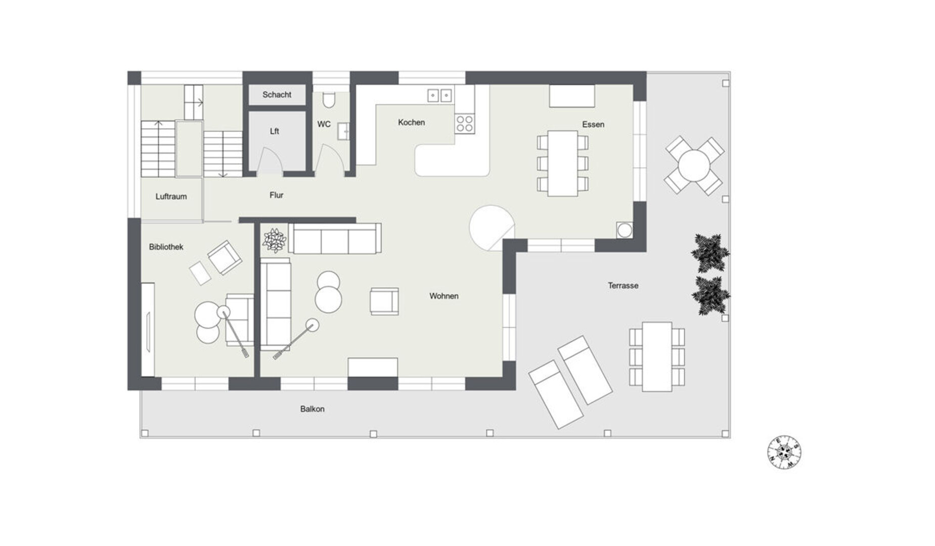 Das Dachgeschoss bildet das Herzstück der Villa und ist ganz dem Wohnen und Genießen gewidmet. Hier eröffnet sich ein spektakulärer Panoramablick über den Bodensee, der besonders von der großzügigen, über 64 m² großen Terrasse eindrucksvoll zur Geltung kommt. Edles Parkett aus geräucherter Eiche und ein weiterer Heizkamin sorgen für ein stilvolles und behagliches Ambiente. Die luxuriös ausgestattete Küche mit Arbeitsplatten aus exklusivem grünem Granit erfüllt höchste Ansprüche an Design und Funktionalität.