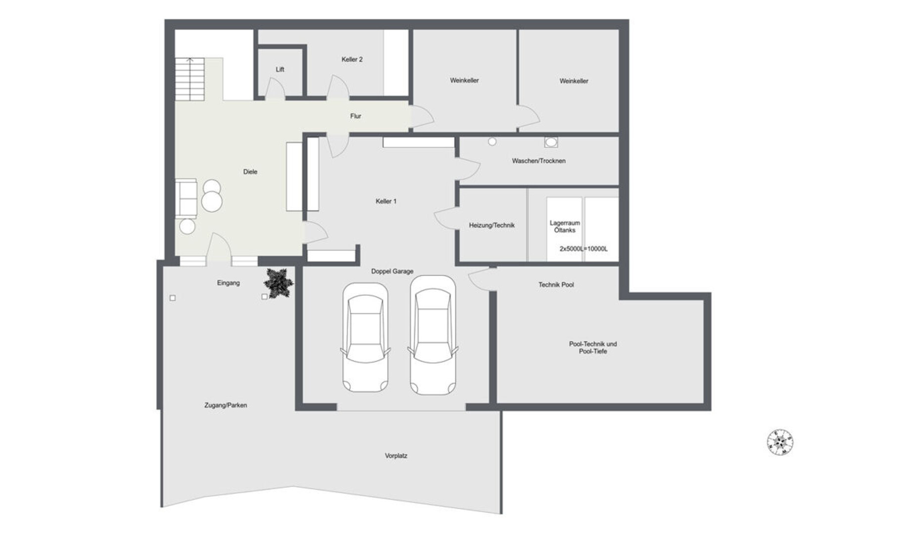 Bereits im Hanggeschoss empfängt Sie ein großzügiger Eingangsbereich, der einen stilvollen ersten Eindruck vermittelt. Auf dieser Ebene befinden sich zudem eine geräumige Doppelgarage mit direktem Hauszugang, Technikräume für Heizung und Pool, praktische Kellerräume sowie ein Weinkeller. Ein Personenlift verbindet alle Etagen komfortabel miteinander und gewährleistet barrierearmen Zugang zu sämtlichen Wohngeschossen. Ein zusätzlicher Stellplatz steht direkt vor dem Eingangsbereich zur Verfügung.