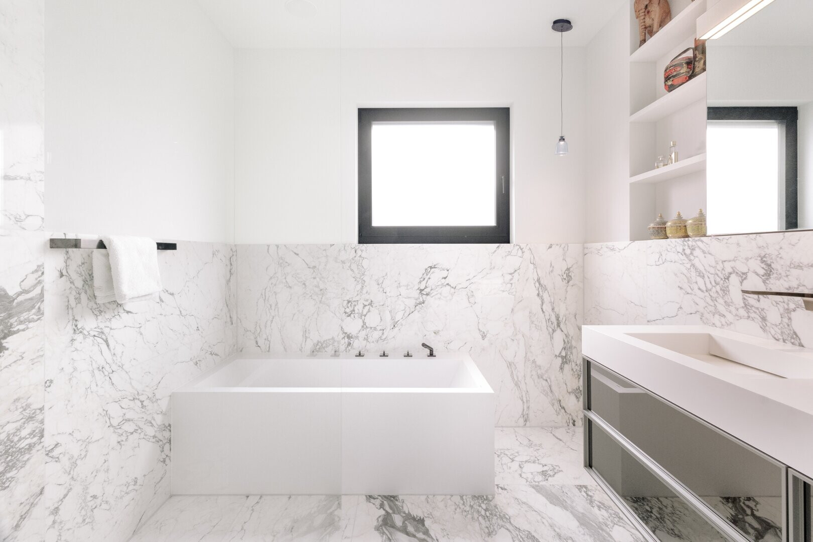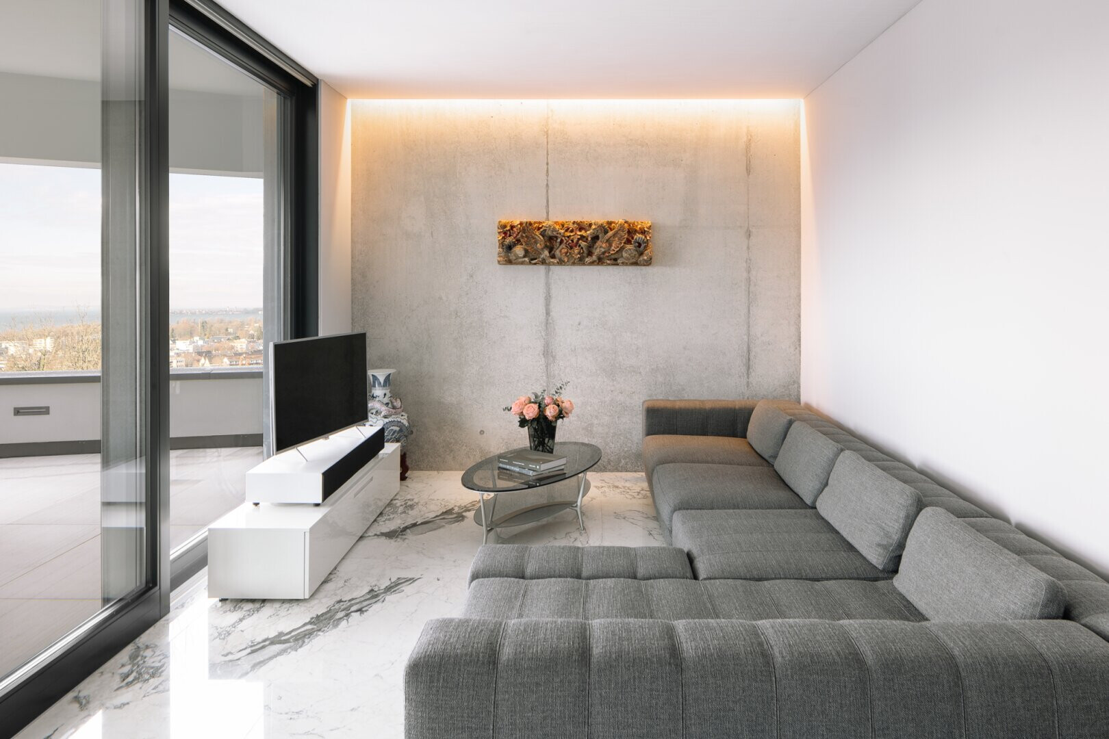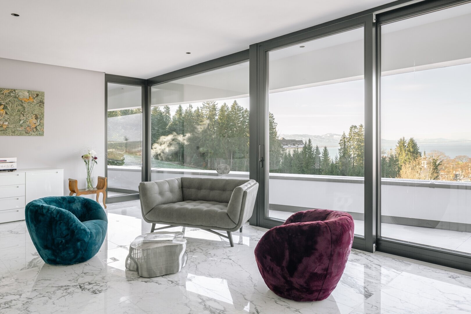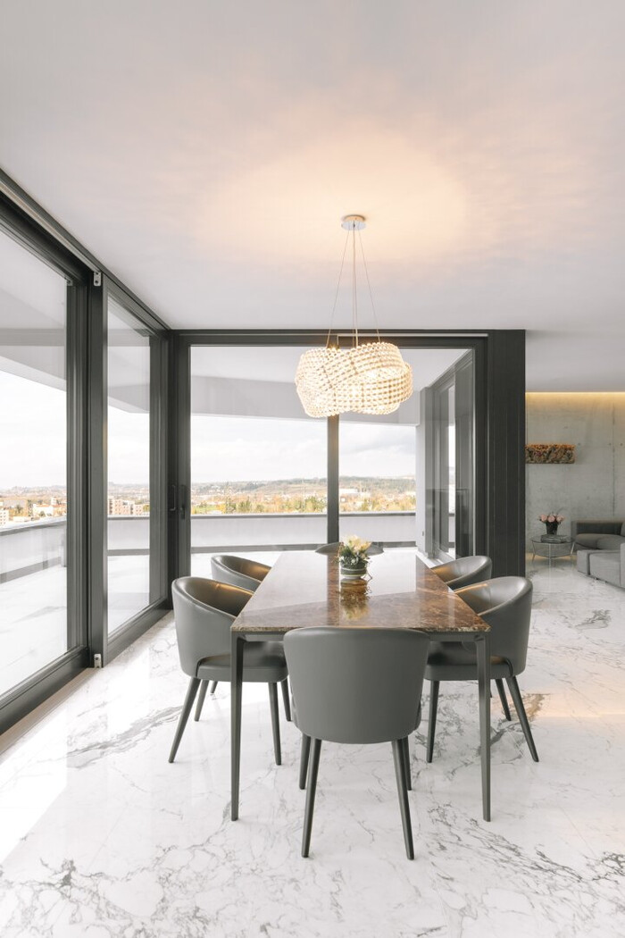 Das Obergeschoss ist das Herzstück der Villa. Lichtdurchflutete Wohn- und Essbereiche schaffen ein einladendes Ambiente, das durch maßgefertigte Möbel und italienischen Marmor geprägt ist. Die etwa 18 Meter lange und raumhohe Fensterfront ist durch vier große Schiebetüren geprägt. Sie sorgt nicht nur für hervorragende Lichtverhältnisse, sondern auch einen uneingeschränkten Blick auf die Umgebung. Durch die Schiebetüren öffnet sich die ca. 52 Quadratmeter große Terrasse, die mit Quarzit-Fliesen eine elegante und witterungsbeständige Basis bietet und durch einen beeindruckenden, umlaufenden Panoramablick begeistert.