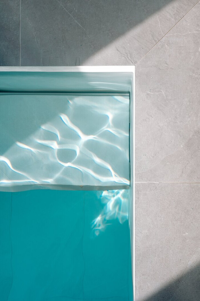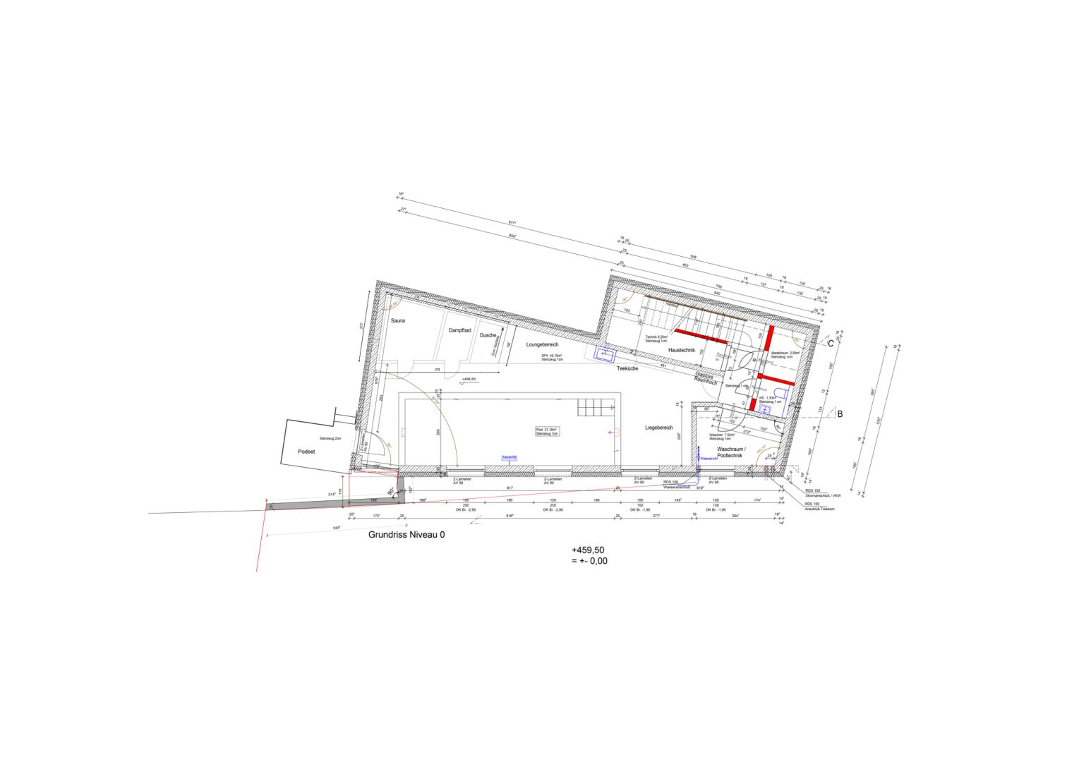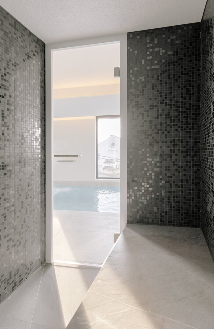 Im Untergeschoss erwartet Sie ein großzügiger Wellness- und Spa-Bereich mit etwa 45 Quadratmetern, der einen ca. 2,5 x 8,2 Meter großen Pool, Sauna, Dampfbad, WC und einen Duschbereich umfasst. Zudem besteht direkter Zutritt zur Terrasse, die zusätzlichen Raum für Entspannung bietet und durch eine verbindende Außentreppe den Zugang zu allen drei Terrassenebenen ermöglicht. Die Gestaltung schafft zudem Raum für Fitness, Yoga und gemütliche Zonen zum Liegen und Sitzen. Die Technik für das Schwimmbad umfasst ein selbstregulierendes System, das die Einspeisung von Chlor, die Messung des pH-Werts sowie die Rückspülung und Reinigung automatisch steuert, um eine optimale Wasserqualität zu gewährleisten. Zusätzlich stehen ein Abstellraum mit rund 2,6 Quadratmetern, ein Waschraum mit etwa 7 Quadratmetern und ein Technikraum mit circa 8,2 Quadratmetern zur Verfügung.