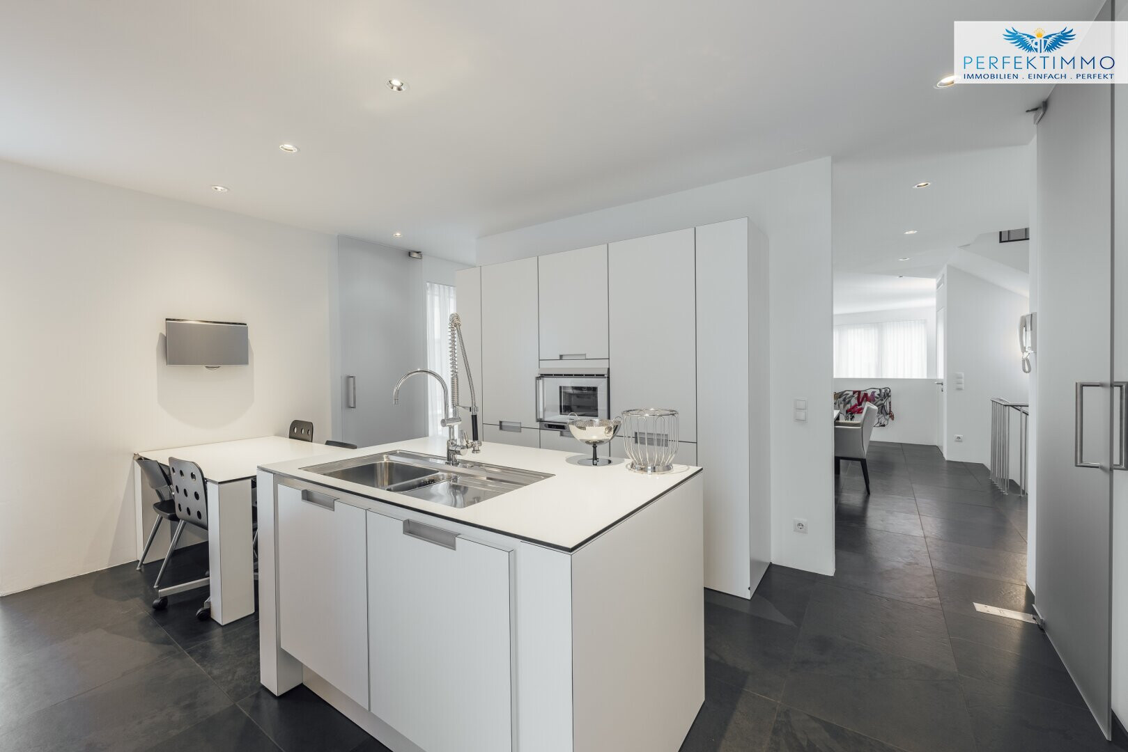 Die Bäder sind mit edlem Marmor und hochwertiger Sanitärkeramik von Duravit (Design: Philippe Starck) ausgestattet. In der Designer-Küche von Poggenpohl mit Gaggenau-Geräten wird Kochen zum Erlebnis. Ein ausgefeiltes Beleuchtungskonzept von Zumtobel sorgt für stimmungsvolle Lichtakzente, ergänzt durch eine stilvolle Außenbeleuchtung.