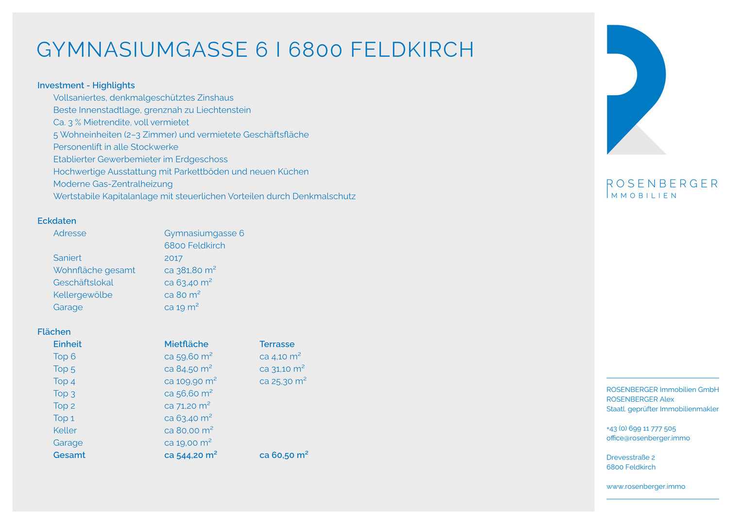 - Vollsaniertes Zinshaus in absoluter Bestlage der Feldkircher Innenstadt. Die denkmalgeschützte Liegenschaft in der Gymnasiumgasse wurde 2017 umfassend generalsaniert und verbindet historischen Charme mit modernem technischen Standard. Die zentrale Lage mit unmittelbarer Infrastruktur und Nähe zu Liechtenstein sichert eine dauerhaft hohe Nachfrage.