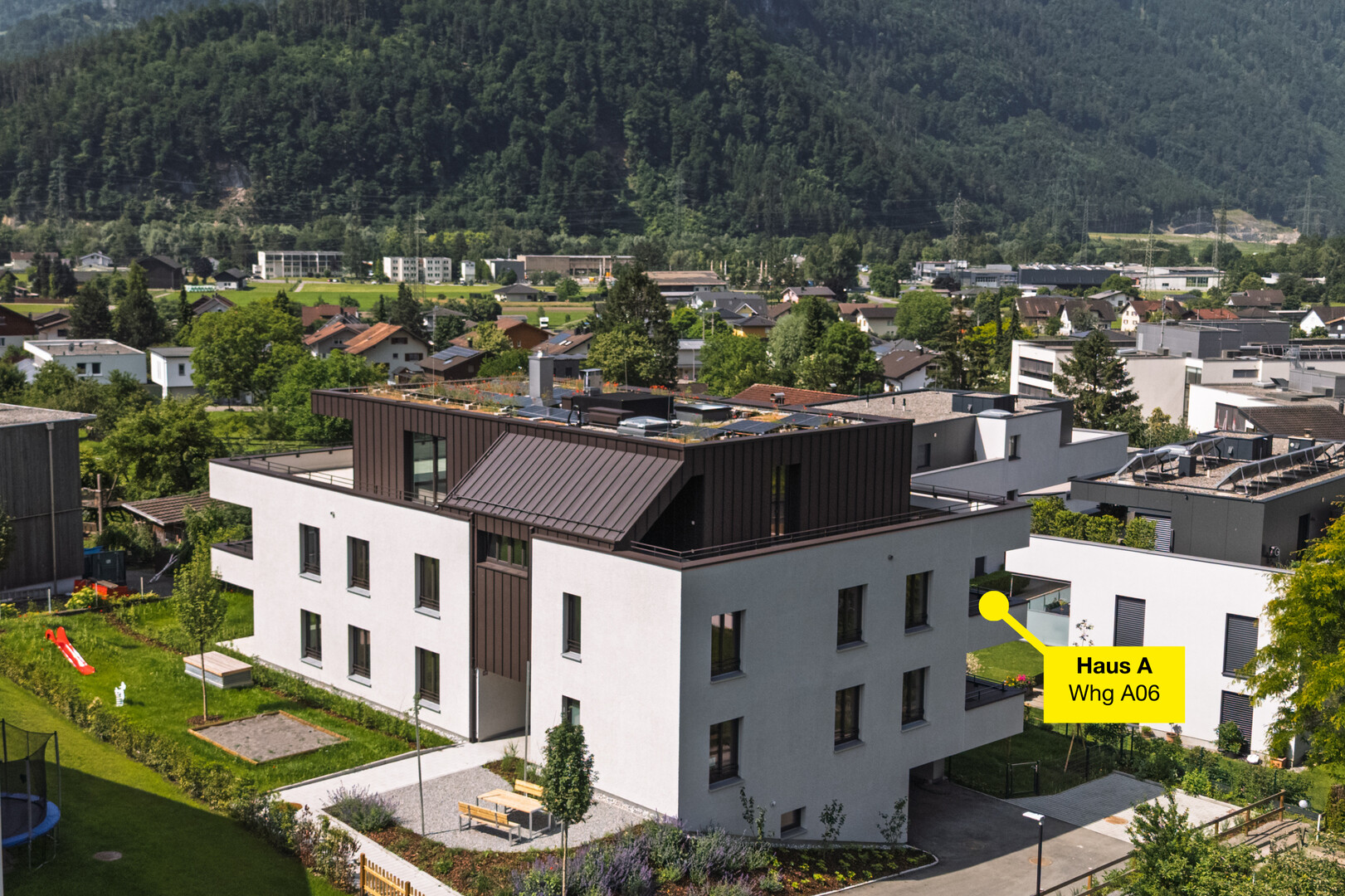 Diese Wohnung im ersten Stock verbindet eine zurückhaltend elegante Architektur mit hochwertigen Materialien. Der Wohn- und Essbereich öffnet sich zu einer überdachten Terrasse, die den Blick ins Grüne einfängt und den Innenraum nach außen erweitert. Echtholz-Parkett in den Wohnräumen, eine komfortable Fußbodenheizung mit Kühlfunktion und moderne Holzfenster mit 3-fach-Isolierverglasung schaffen ein angenehmes, ausgewogenes Raumklima.