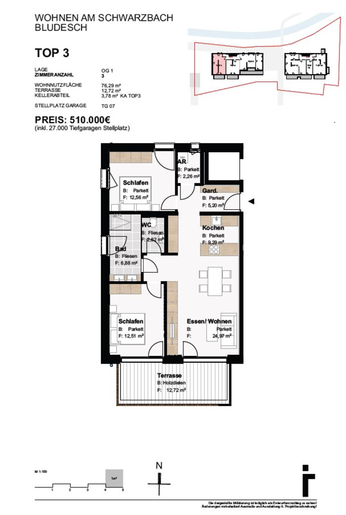 Der Tiefgaragenplatz kostet zusätzlich € 27.000,00.