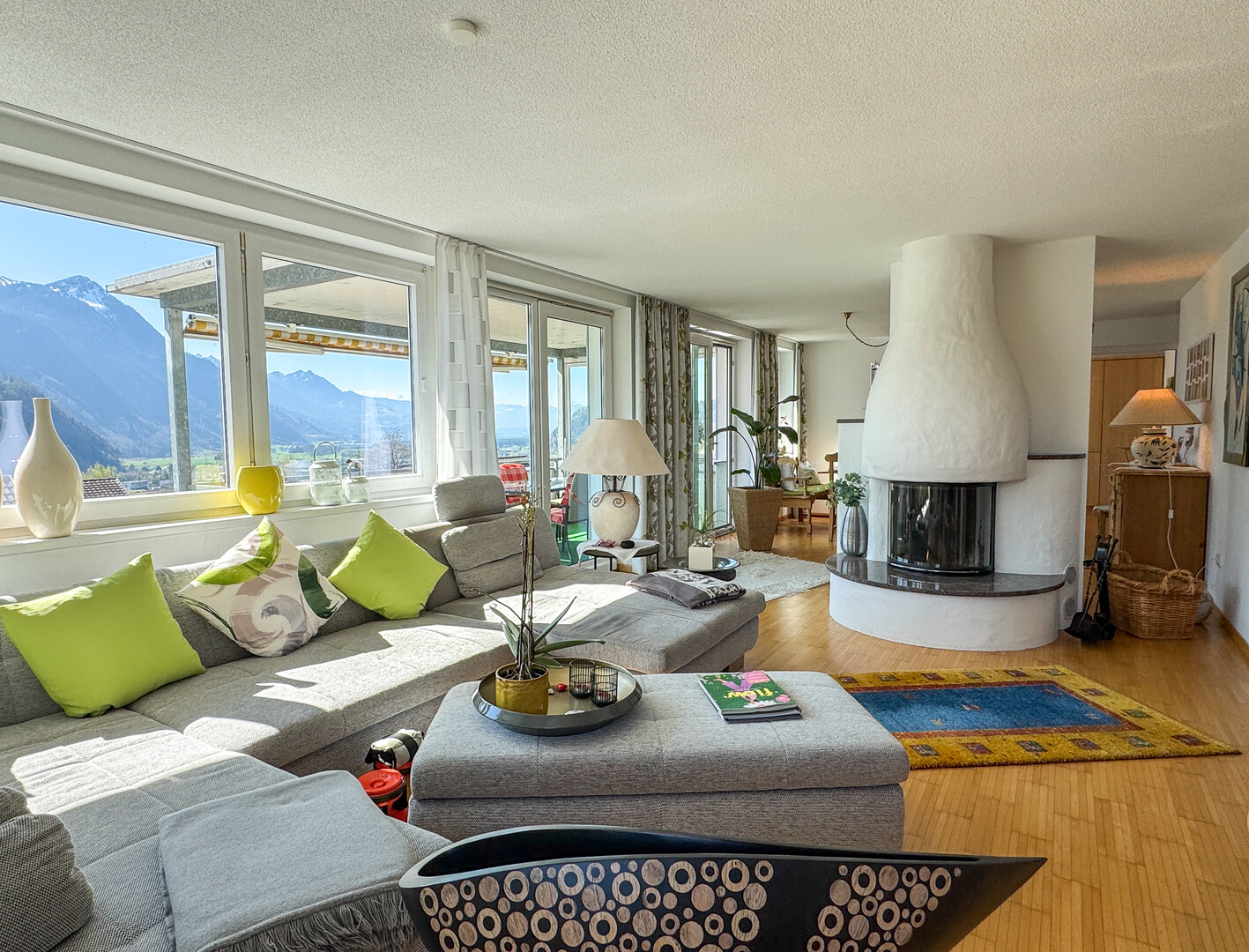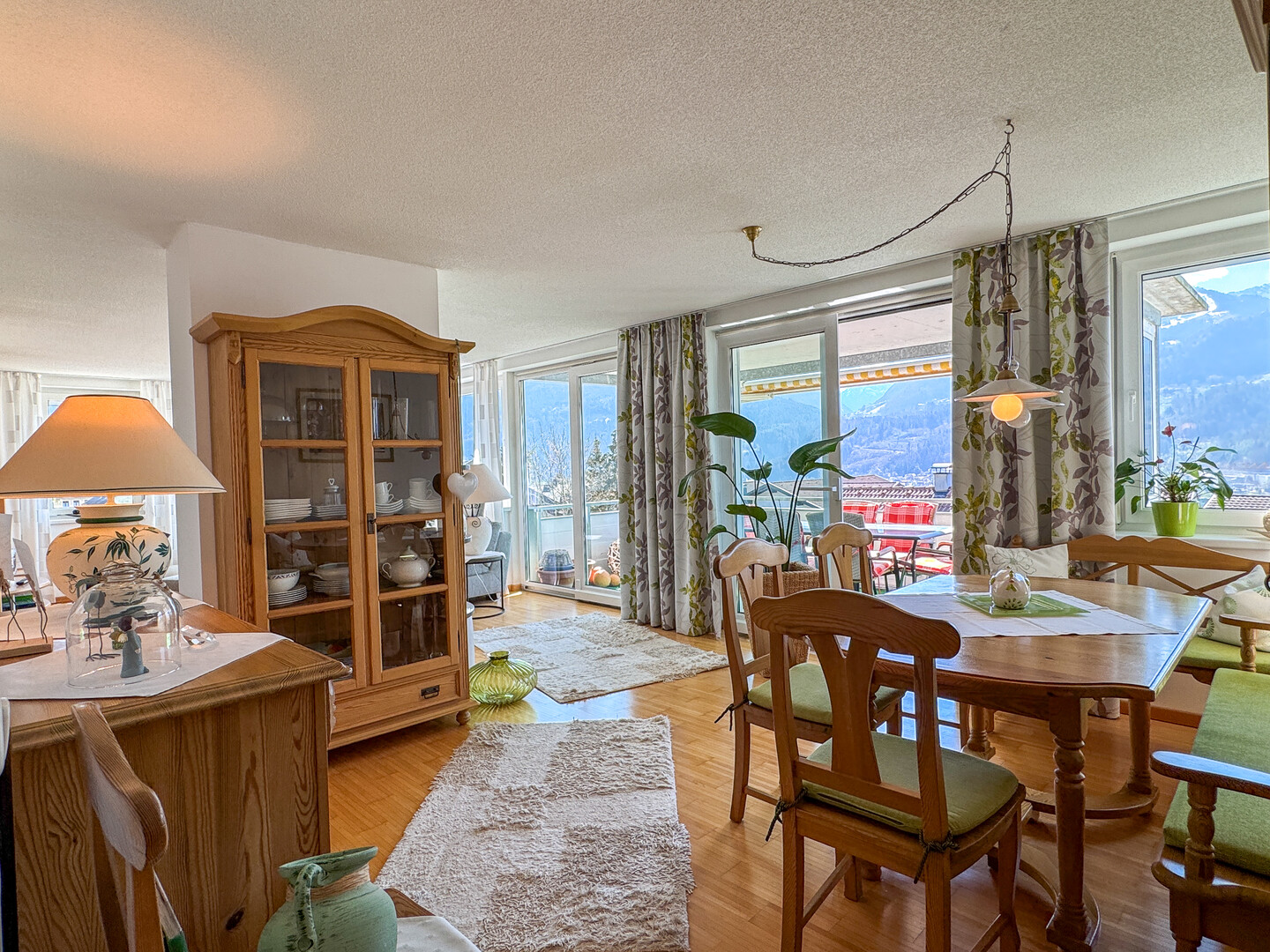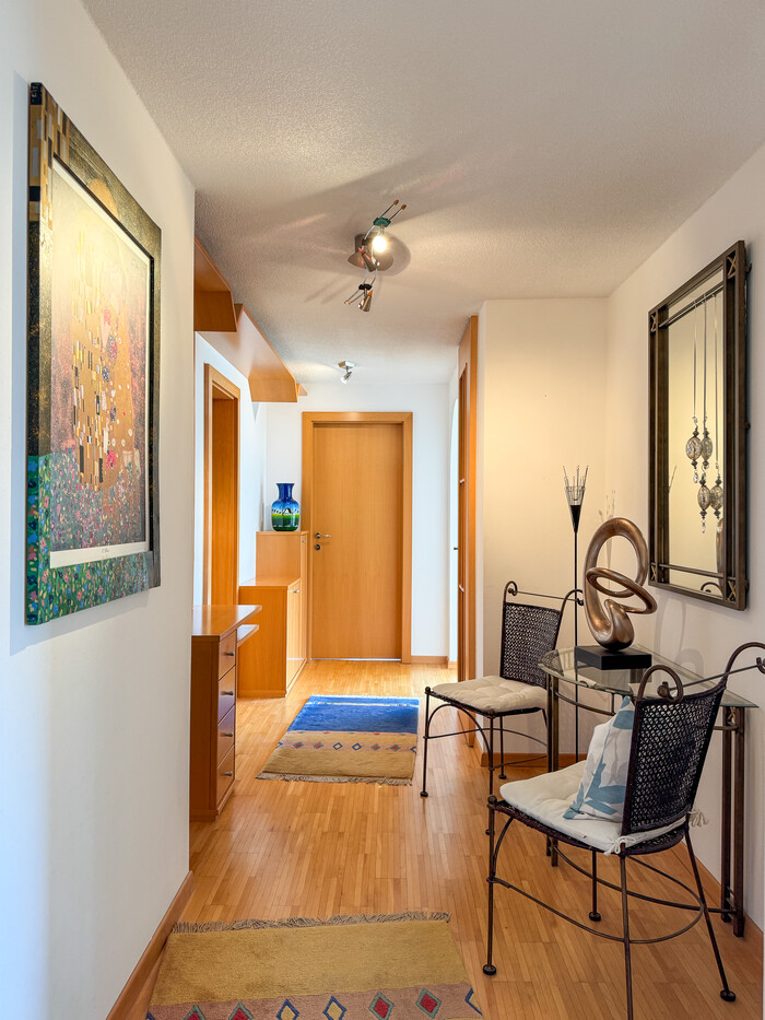 Bereits beim Betreten wird klar: Hier steht Raum und Wohnqualität im Vordergrund. Großzügige Zimmer, viel Glasfläche und eine freundliche Atmosphäre sorgen für ein besonders angenehmes Wohngefühl. Das Herzstück der Wohnung bildet der weitläufige Wohn- und Essbereich, der durch große Fensterflächen mit Tageslicht durchflutet wird und direkten Zugang zur großzügigen Loggia bietet. Von hier aus genießen Sie einen traumhaften, unverbaubaren Ausblick auf die Berge – ein echtes Highlight.