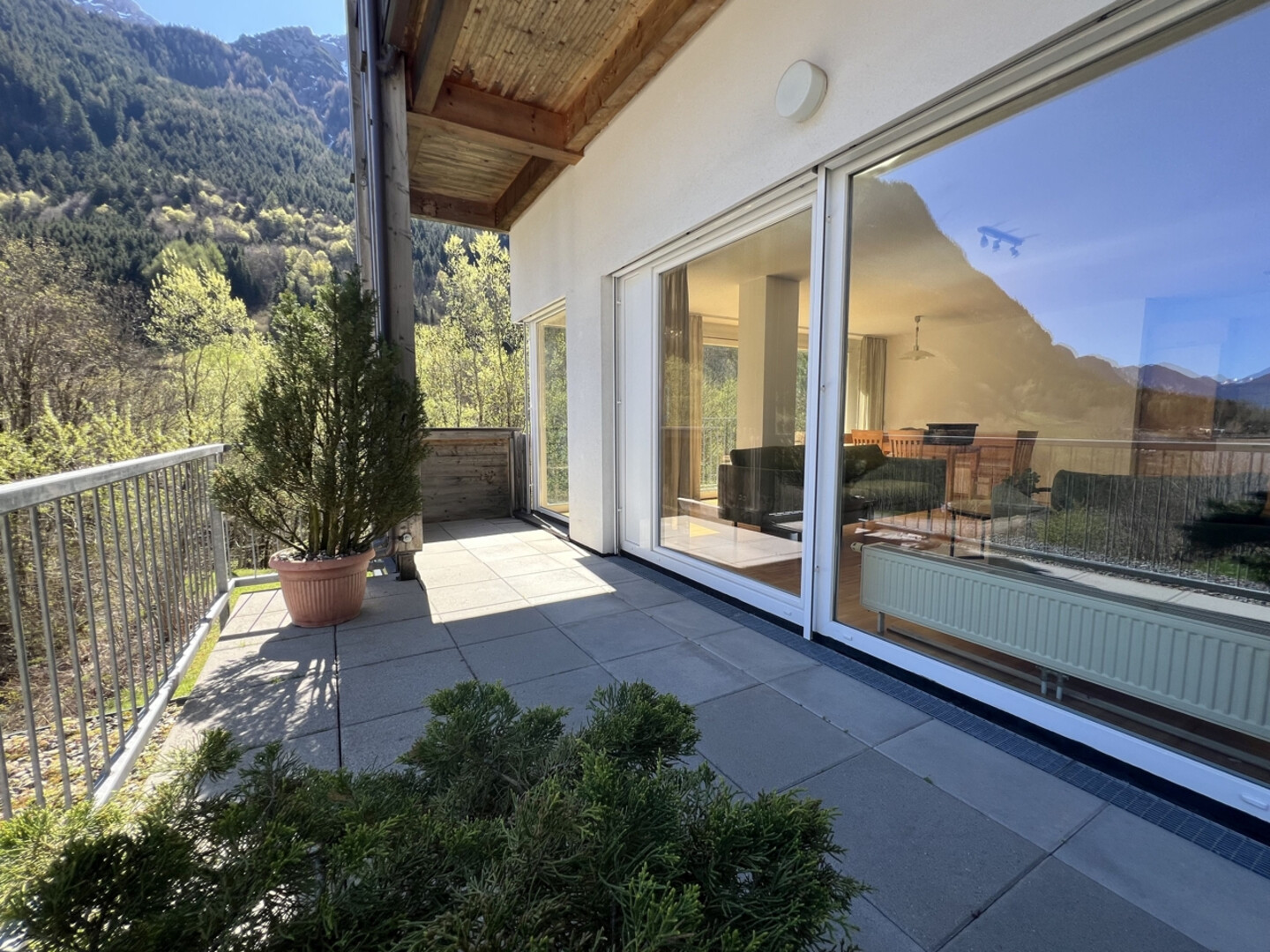 Ein absolutes Highlight ist die großzügige, 23 m² große Terrasse, die einen unverbaubaren Panoramablick auf die beeindruckende Bergkette von Brand eröffnet – der perfekte Ort, um die Ruhe der Natur zu genießen oder den Tag entspannt ausklingen zu lassen.
