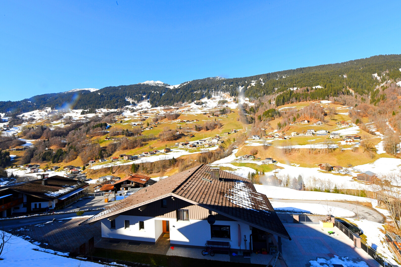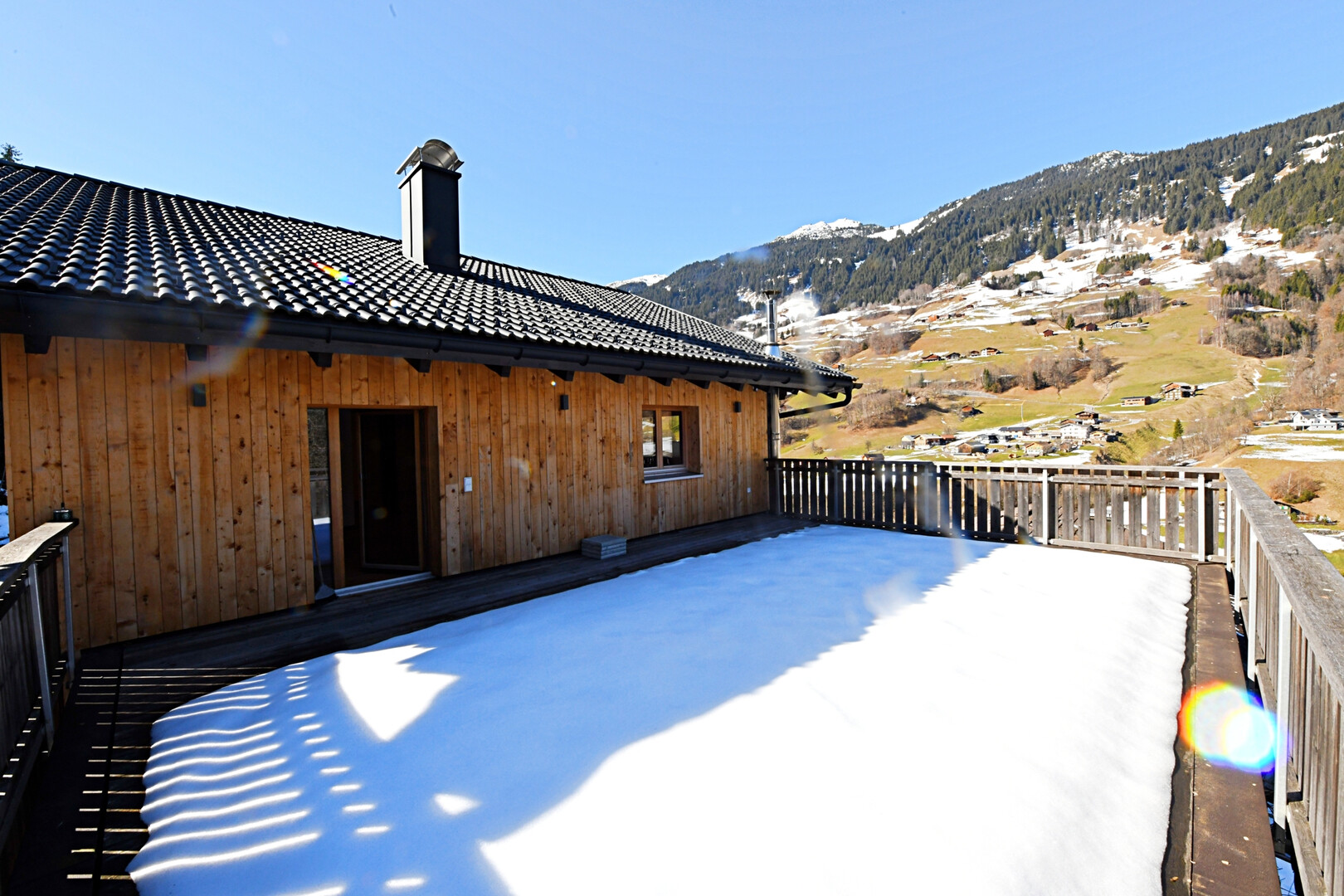 Ein echtes Highlight ist die großzügige Terrasse, von der aus Sie eine wunderschöne Aussicht auf die umliegende Bergwelt genießen. Hier lassen sich entspannte Stunden im Freien verbringen – ob beim Frühstück in der Morgensonne oder beim gemütlichen Ausklang des Tages in ruhiger Umgebung.