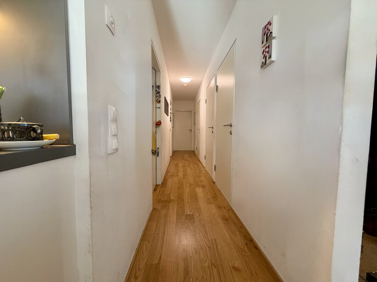 Der helle Wohn- und Essbereich ist mit einer weißen Einbauküche ausgestattet. In den Wohn- und Schlafräumen wurde ein Eichenparkett verlegt, während das Badezimmer mit stilvollen weißen hochglanz Fliesen überzeugt.