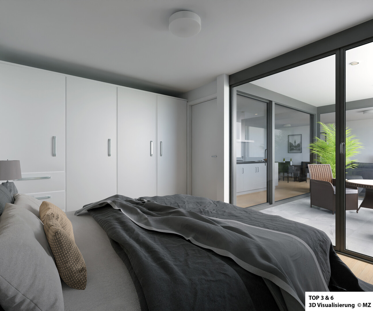 Innenliegende Loggia mit 3-Seiten raumhoher Verglasung und ebenfalls raumhohem Sicht- und Sonnenschutz (Screens).