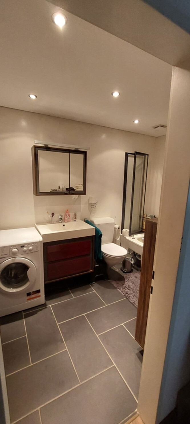 Großzügiges Badezimmer mit Badewanne, WC und Waschmaschinenanschluss