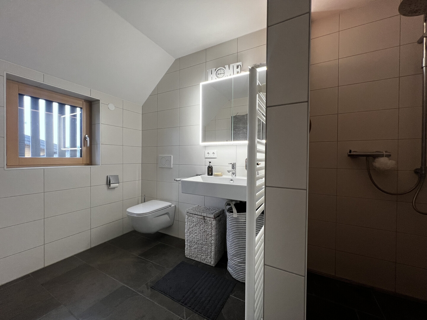 Die hochwertige Einbauküche bietet viel Platz zum Kochen und Arbeiten, während das Badezimmer mit einer Dusche, WC, Waschbecken mit Spiegelschrank und einem Anschluss für die Waschmaschine ausgestattet ist.