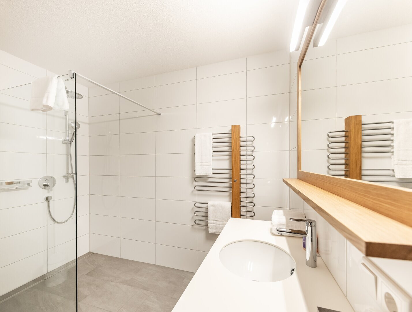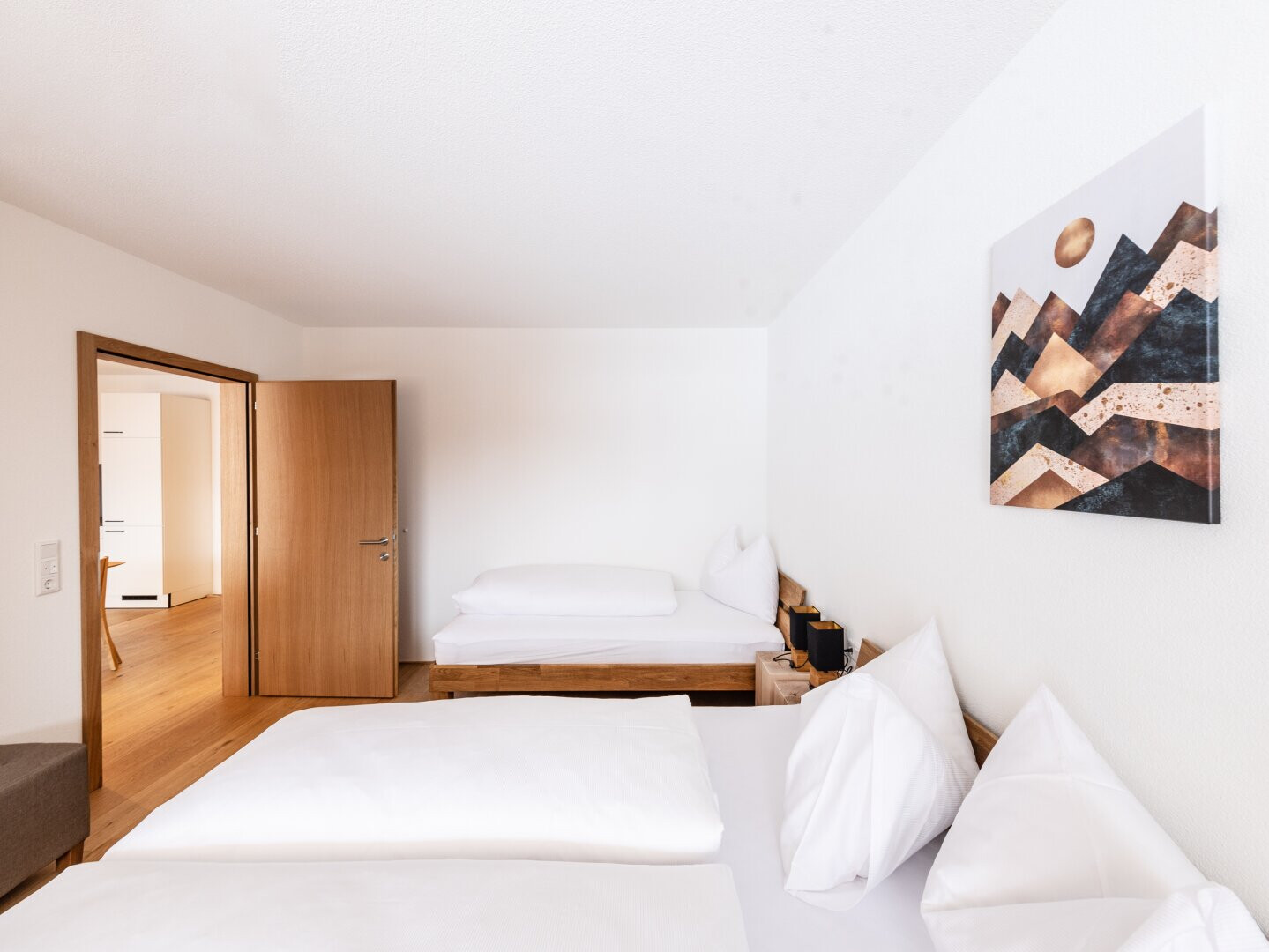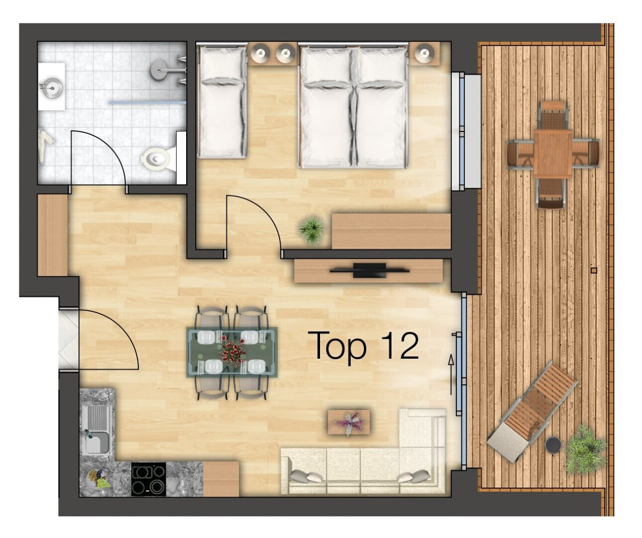Das Top 12 im 1.OG des Haus 2 umfasst ca. 49 m² und bietet einen hellen Wohn-Essbereich mit Küchenzeile, ein Schlafzimmer mit 3 Betten, ein Bad mit Regendusche und WC sowie einen überdachten Balkon.