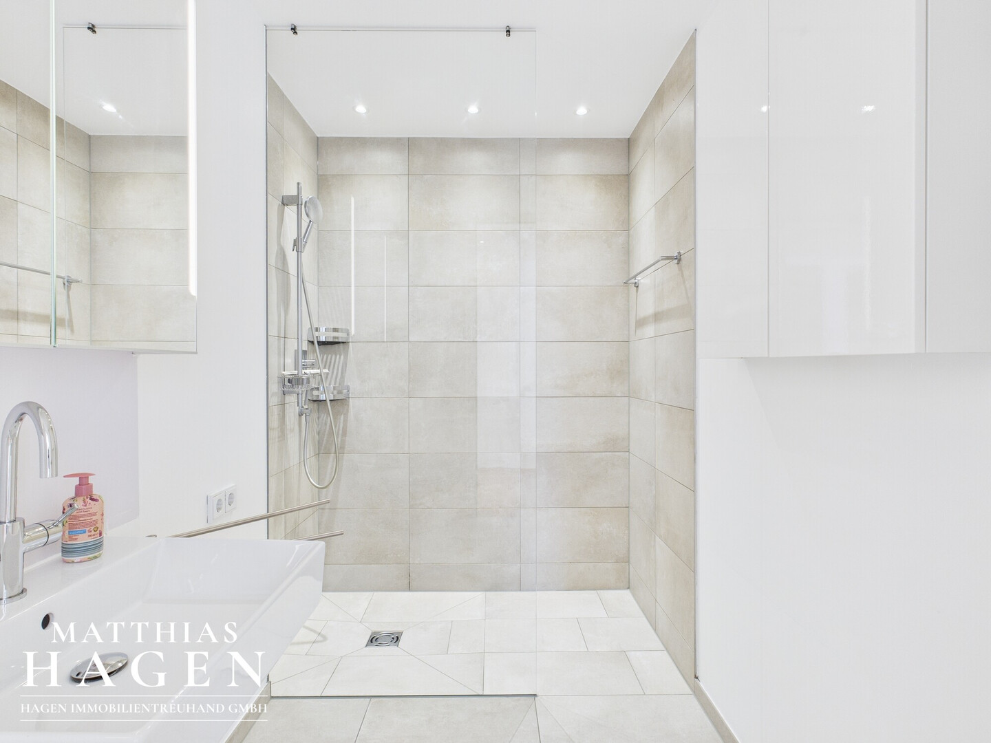 Das stilvolle Badezimmer überzeugt mit einer großen, bodengleichen Dusche. Ein Tiefgaragenplatz ist bereits im Angebot inkludiert, zusätzlich stehen ausreichend Außenabstellplätze zur Verfügung.