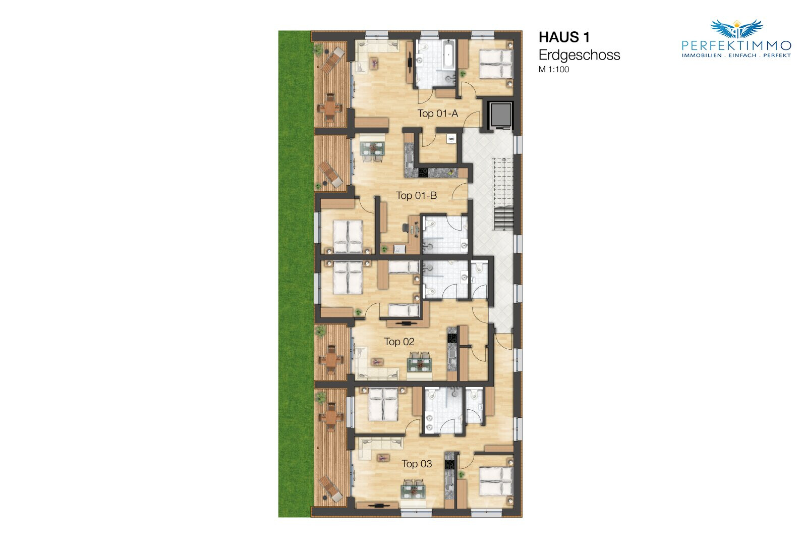 Die Top 3 im Erdgeschoss des Haus 1 umfasst ca. 67 m² und bietet einen hellen Wohn-Essbereich mit Küchenzeile, zwei Schlafzimmer, ein Bad mit Regendusche und WC, ein separates WC sowie eine Terrasse mit Gartenanteil.