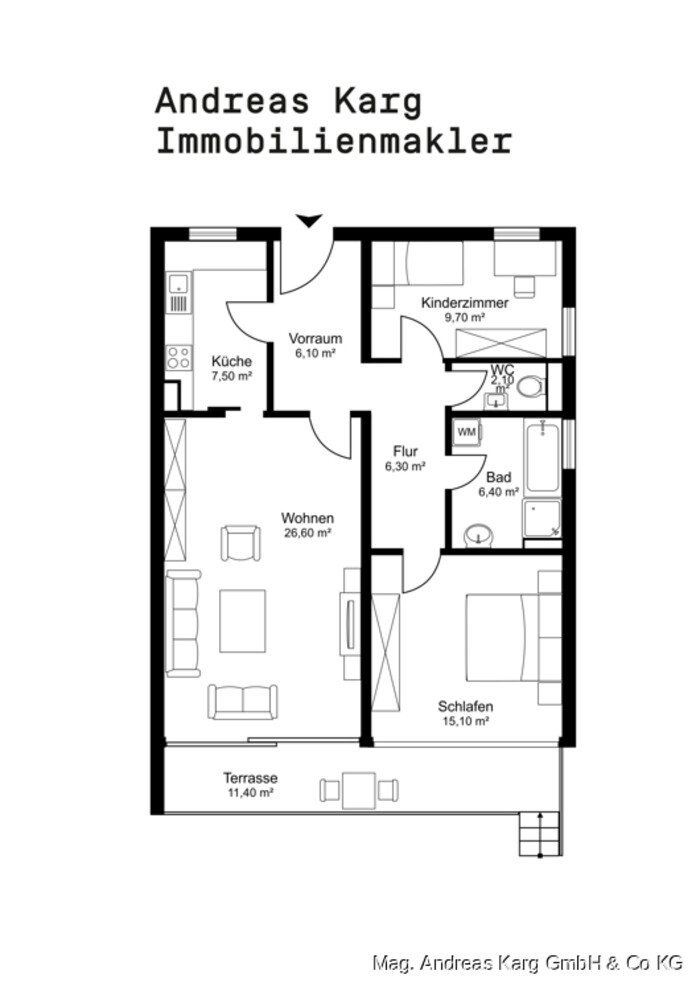 Der großzügige Wohn-/Essbereich mit direktem Zugang zur Terrasse bildet das Herzstück der Immobilie. Eine separate Küche, ein gut geschnittenes Schlafzimmer, ein ruhiges Kinder- bzw. Arbeitszimmer sowie Bad und WC in getrennten Einheiten geben Ihnen sofort ein Gefühl von Zuhause. Die Wohnung eignet sich ideal für Eigennutzer als auch für Kapitalanleger.