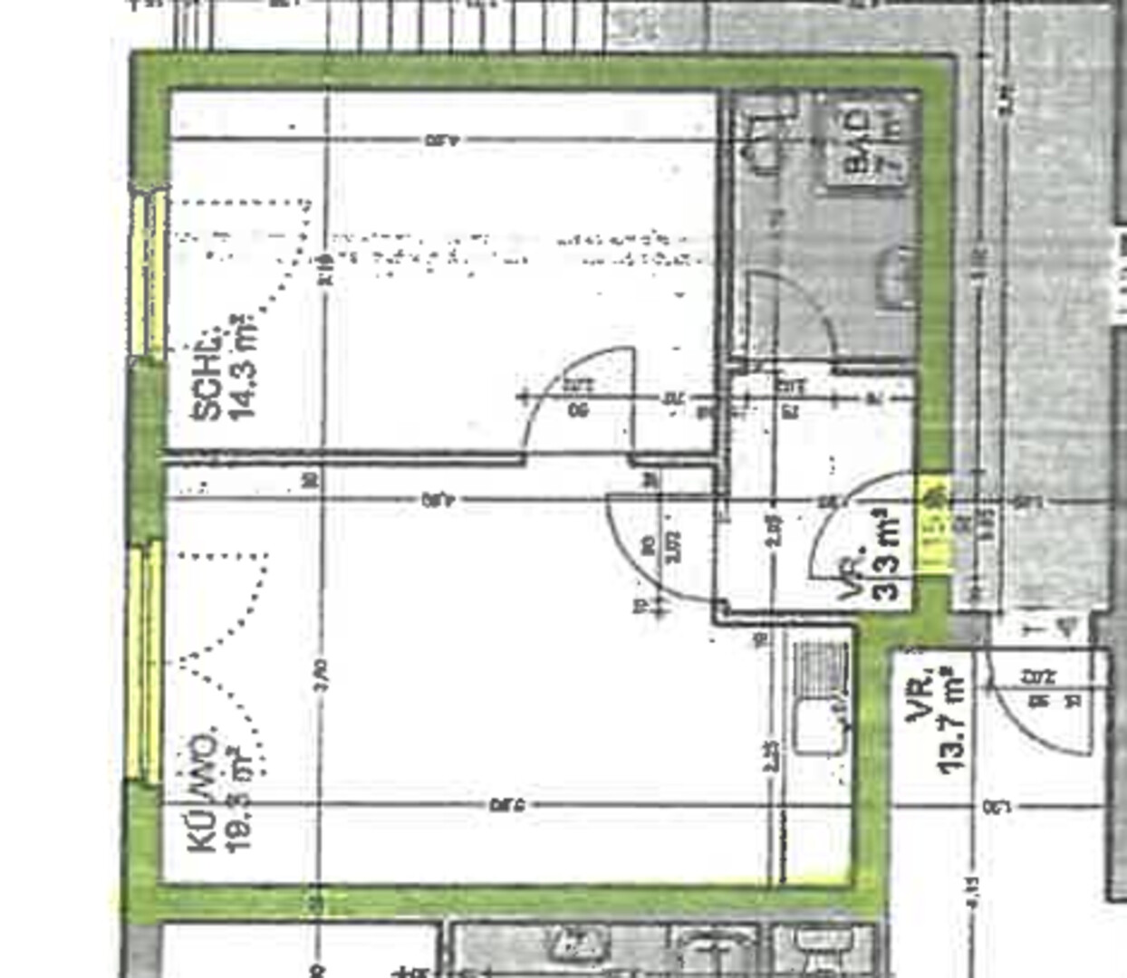 Einteilung: Vorraum, Wohn/Esszimmer mit Küche , Schlafzimmer, Dusche/WC, Kellerabteil