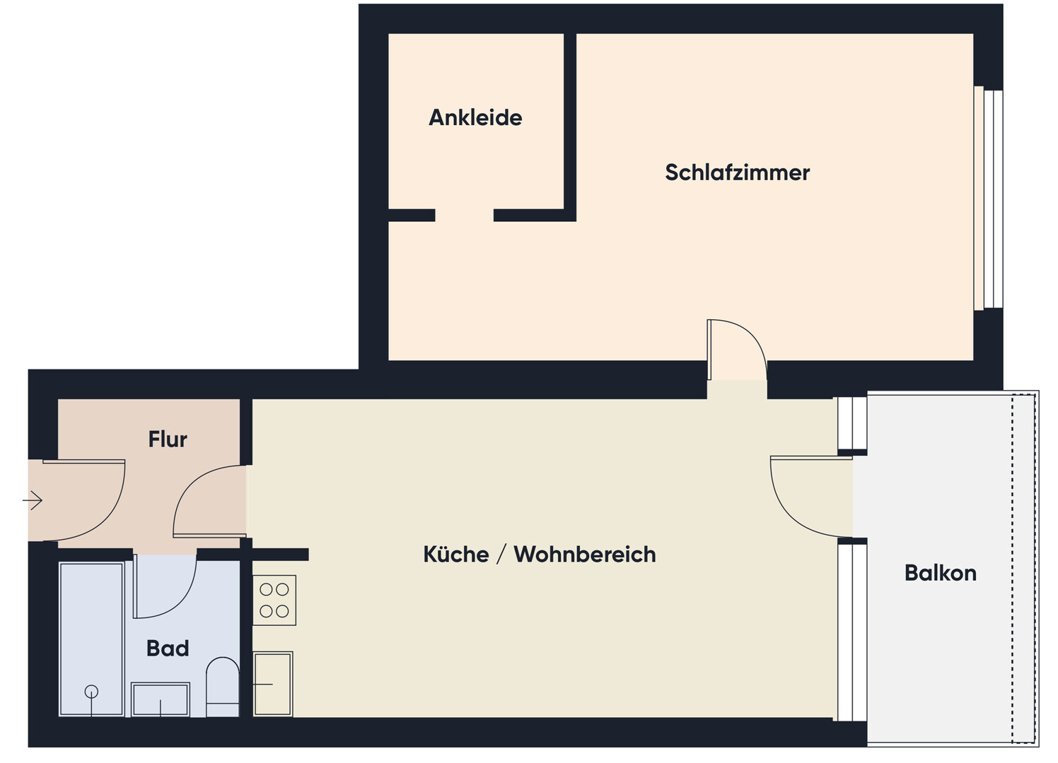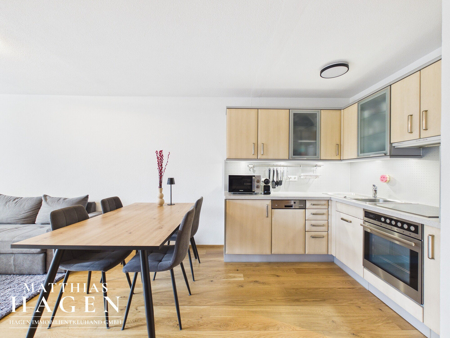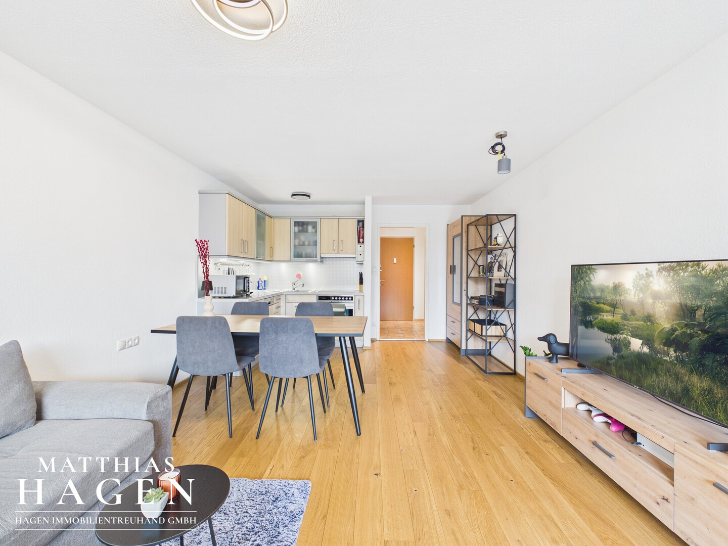 Das Herzstück der Wohnung ist der große Wohn- und Essbereich mit integrierter Küche, der viel Raum für gemütliche Stunden und geselliges Beisammensein bietet. Das geräumige Schlafzimmer verfügt zusätzlich über einen abgetrennten Bereich, der sich ideal als Ankleidezimmer oder praktischer Abstellraum nutzen lässt. Das Badezimmer ist mit einer Dusche ausgestattet und funktional gestaltet.