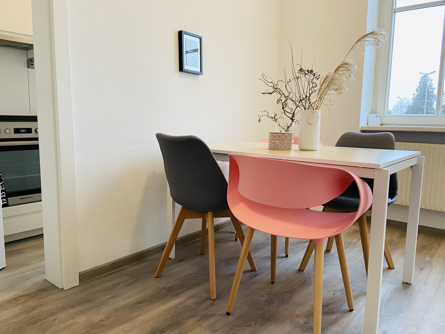 Die schöne Esstischgruppe hat Platz für 4 Personen. Es gibt ein bequemes Schlafsofa und ein Smart TV. Durch die Fenster fällt der Blick zum wunderschönen Bodensee. Die Einbauküche ist mit allem ausgestattet, was benötigt wird inkl. Kaffeemaschine.