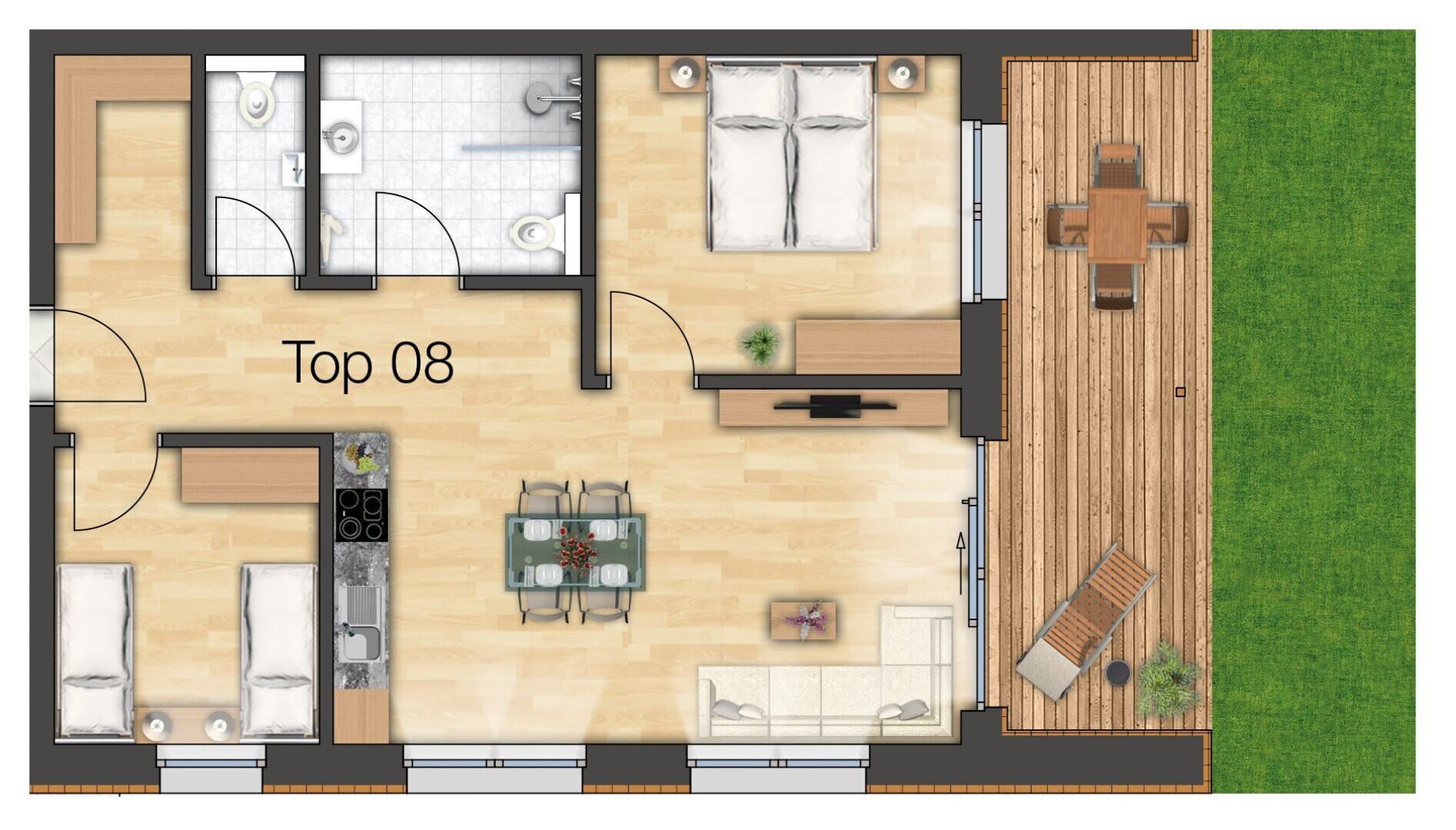 Das Top 8 im Erdgeschoss des Haus 2 umfasst ca. 71 m² und bietet einen hellen Wohn-Essbereich mit Küchenzeile, zwei Schlafzimmer, ein Bad mit Regendusche und WC, ein separates WC sowie eine Terrasse mit Gartenanteil.