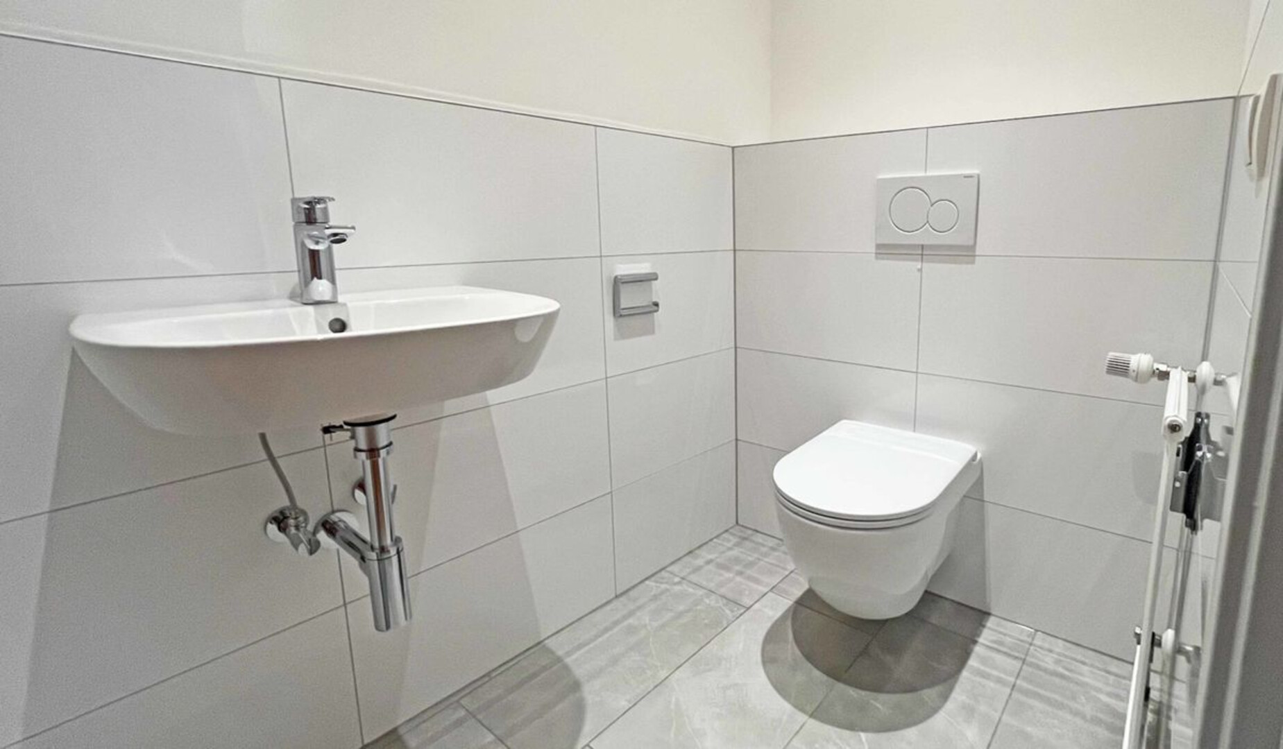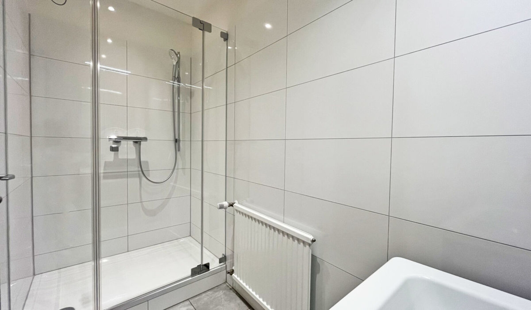 Das Badezimmer ist gefliest und mit einer großen Dusche sowie einem Waschbecken ausgestattet. Im Flur befinden sich zudem eine maßgefertigte Garderobe vom Tischler und ein Abstellraum mit Waschmaschinenanschluss. Ein separates WC ist ebenso vorhanden.