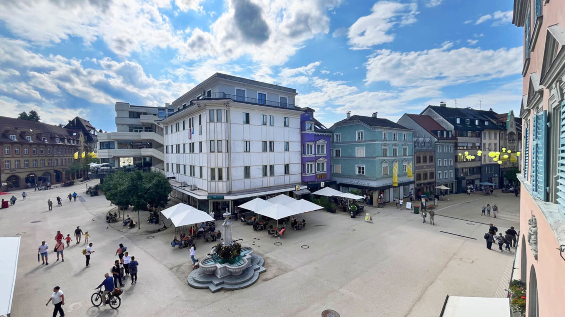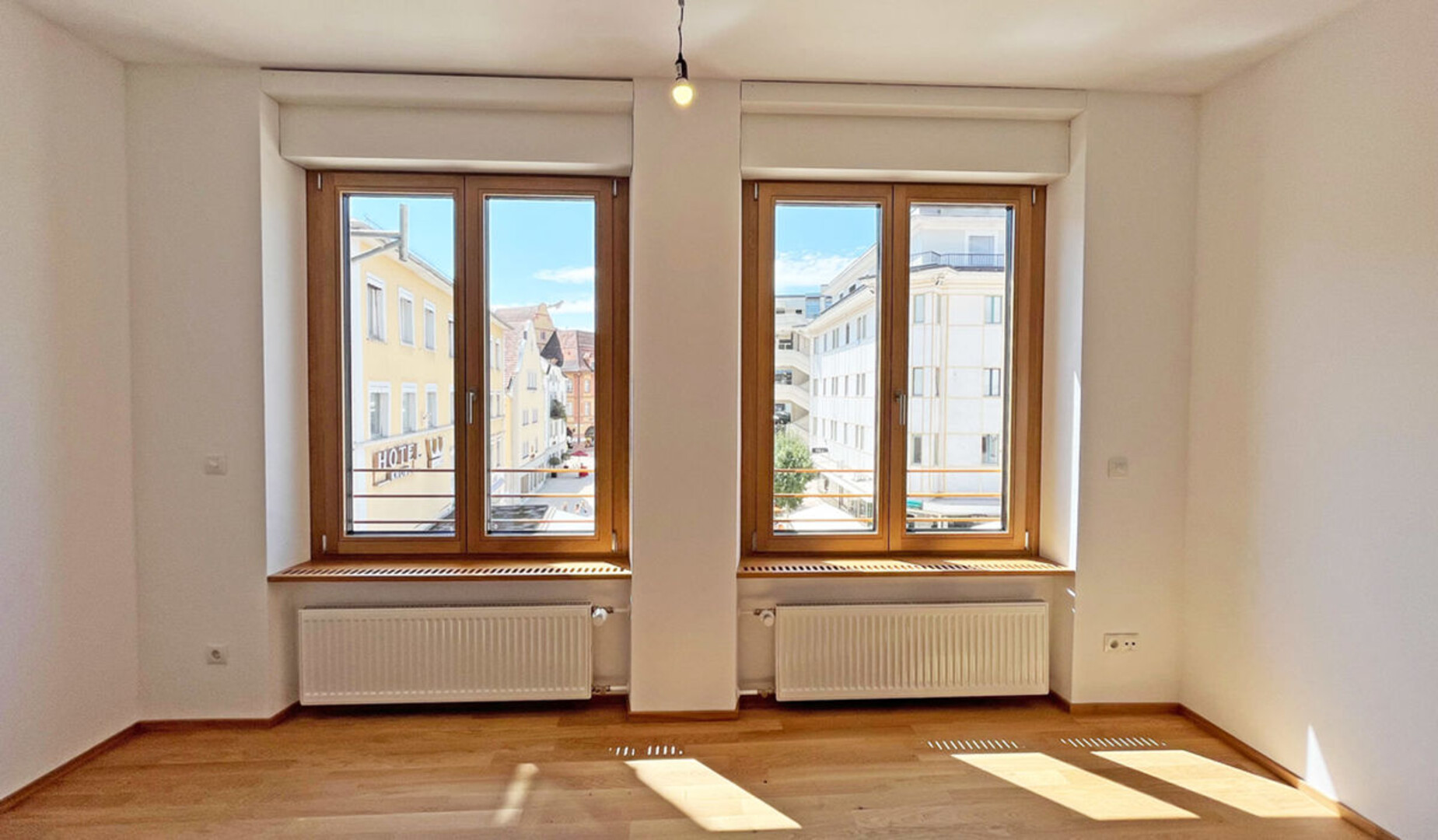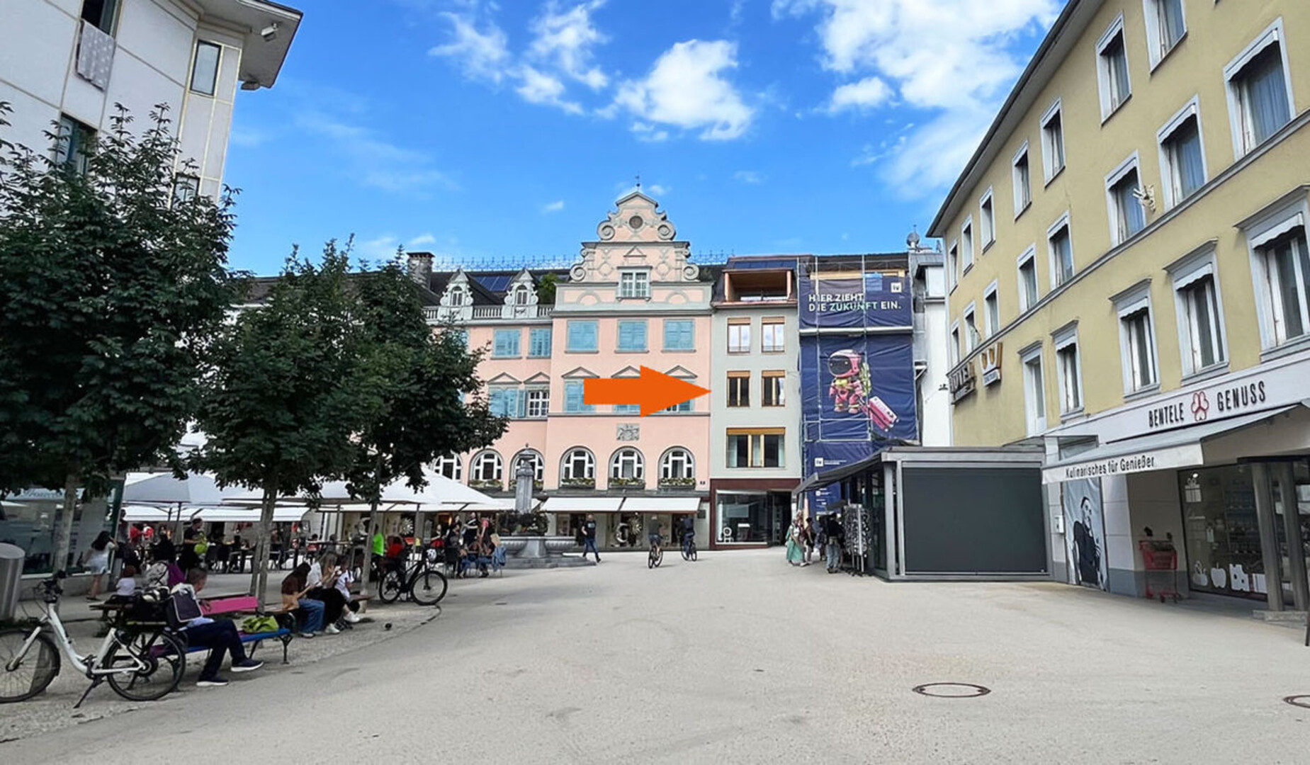 Die Wohnung liegt im Herzen von Bregenz, direkt am Leutbühel mit freiem Blick auf den neu gestalteten Platz. Die Umgebung ist geprägt von historischen Fassaden und modernen Elementen wie bepflanzten Bereichen und Blumenarrangements.