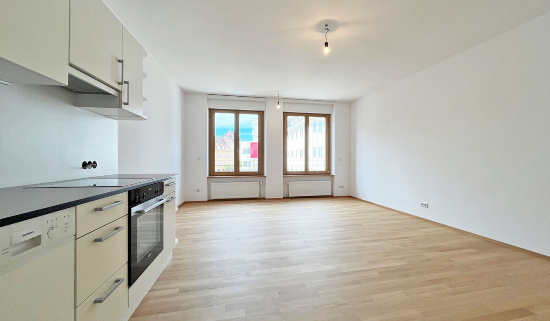 Die helle Einbauküche von Schmidt kombiniert smartes Design mit hochwertiger Siemens-Ausstattung. Dazu gehören ein Geschirrspüler, ein Kühlschrank mit integriertem Gefrierfach, ein Backrohr und ein Kochfeld mit Dunstabzug. Eine elegante Corian-Arbeitsplatte mit passender Rückwand sowie stimmungsvolle Beleuchtungselemente und praktische Anbauschränke runden die Ausstattung ab. Die Einbauküche befindet sich derzeit noch im Aufbau und wird in Kürze vollständig montiert.