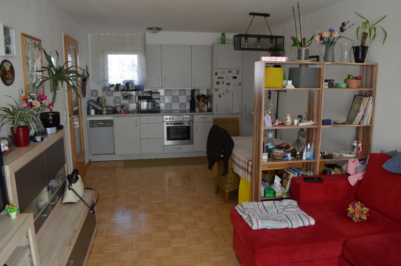 Die Wohnung verfügt über ein Wohn-Esszimmer mit Küche und raumhohen Fenstern. Das