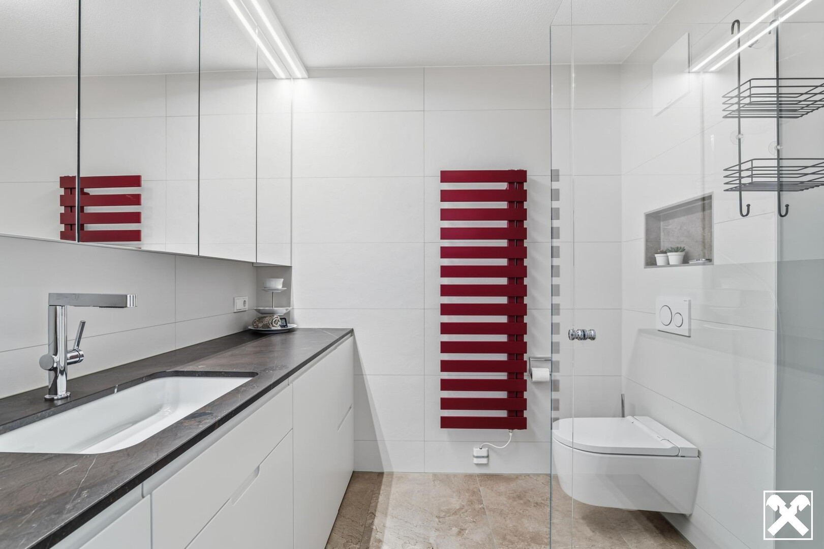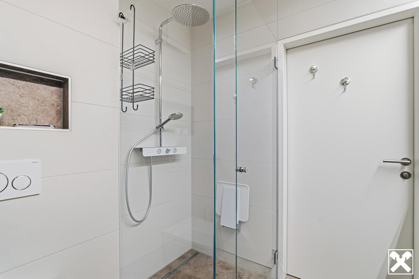 - Raumhoch gefliestes Badezimmer mit großzügiger Dusche, hochwertigem Badverbau und Dusch-WC