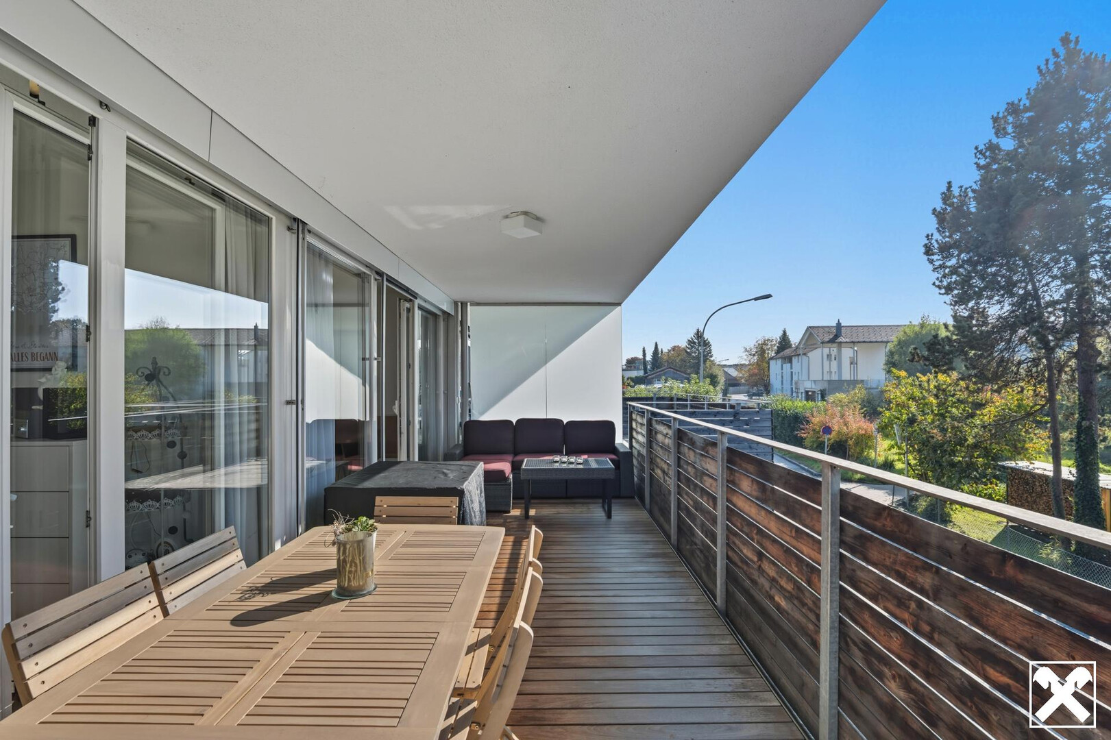 - Langlebiges und robustes Tropenholz auf der großzügigen und überdachten Sonnenterrasse
