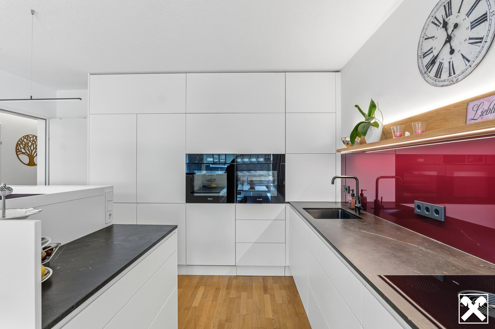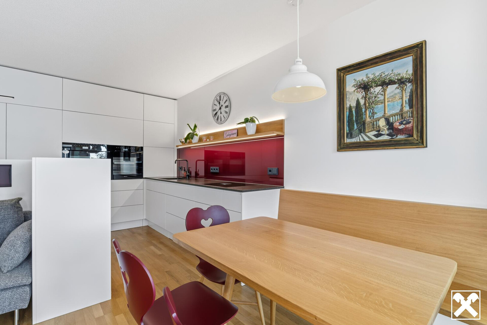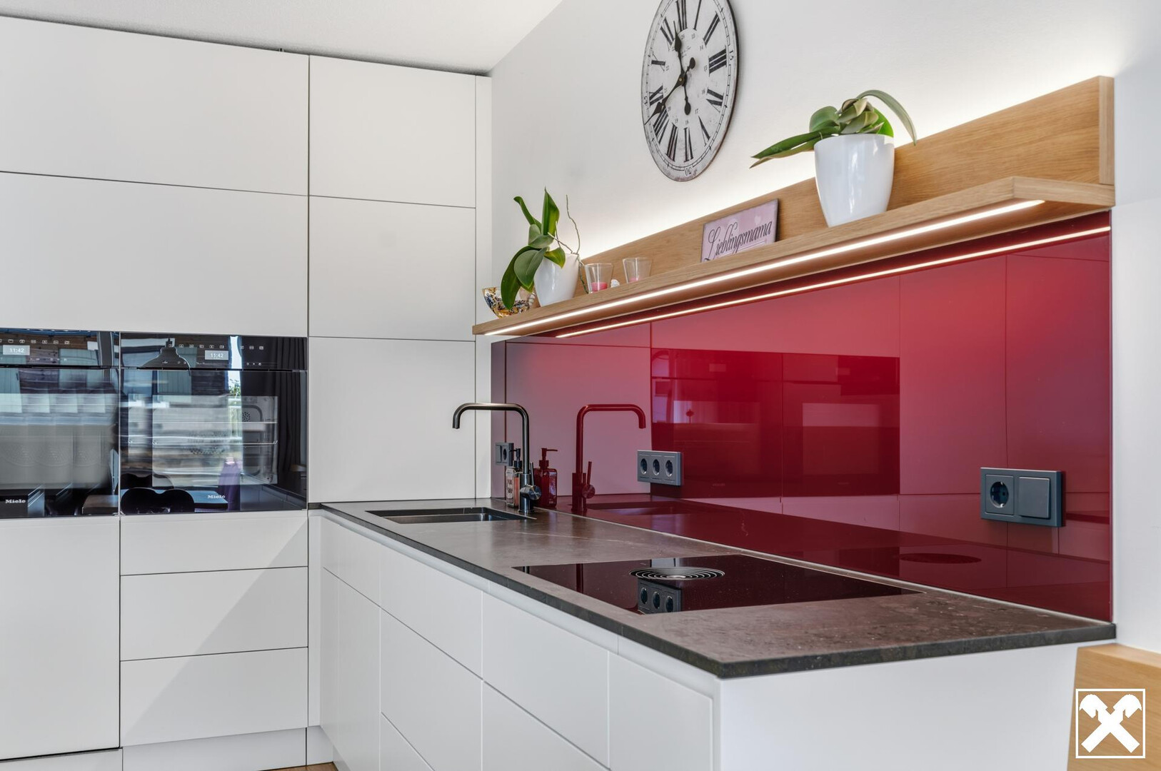 Man spürt den roten Faden, der sich durch dieses Schmuckstück zieht: weißer Schleiflack, Eiche und rote Farbtupfer, dazu noch eine braune Bodenfliese und Steinarbeitsplatte sowie weiße Wandfliesen.